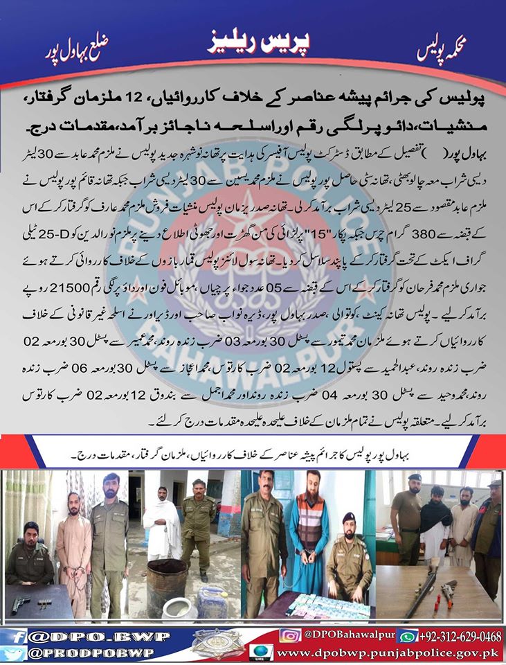 پولیس کی جرائم پیشہ عناصر کے خلاف کارروائیاں ، 12 ملزمان گرفتار، منشيات ،داؤ پر لگی رقم اور اسلحہ ناجائز برآمد،مقدمات درج۔
