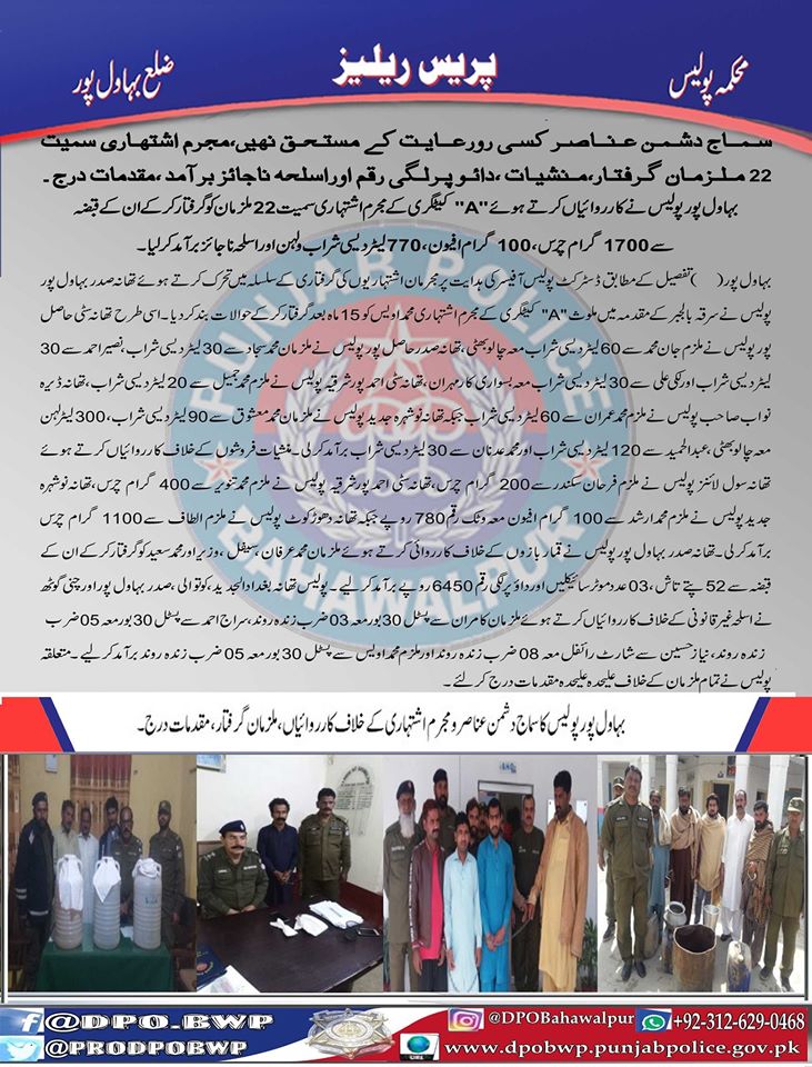 سماج دشمن عناصر کسی رورعایت کے مستحق نہیں، مجرم اشتہاری سمیت 22ملزمان گرفتار،منشيات ،داؤ پر لگی رقم اور اسلحہ ناجائز برآمد ،مقدمات درج۔