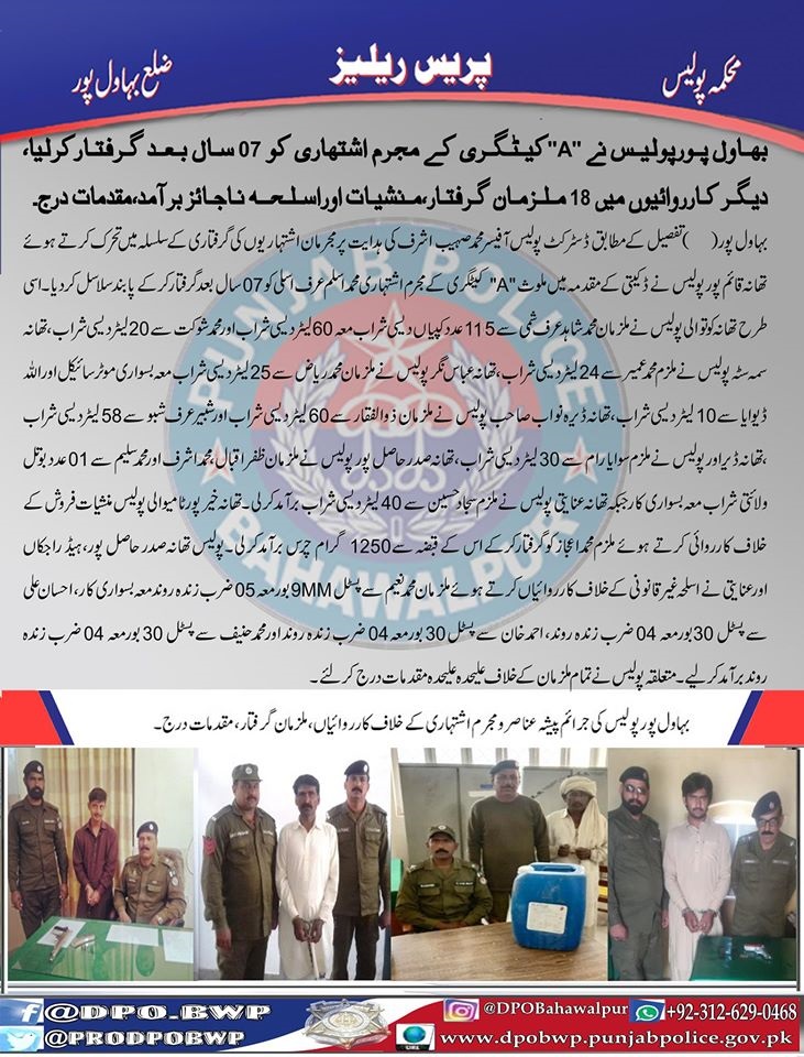 بہاولپور پولیس نے "اے"کیٹگری کے مجرم اشتہاری کو 07سال بعد گرفتار کرلیا، دیگر کارروائیوں میں 18ملزمان گرفتار،منشیات اور اسلحہ ناجائز برآمد،مقدمات درج۔