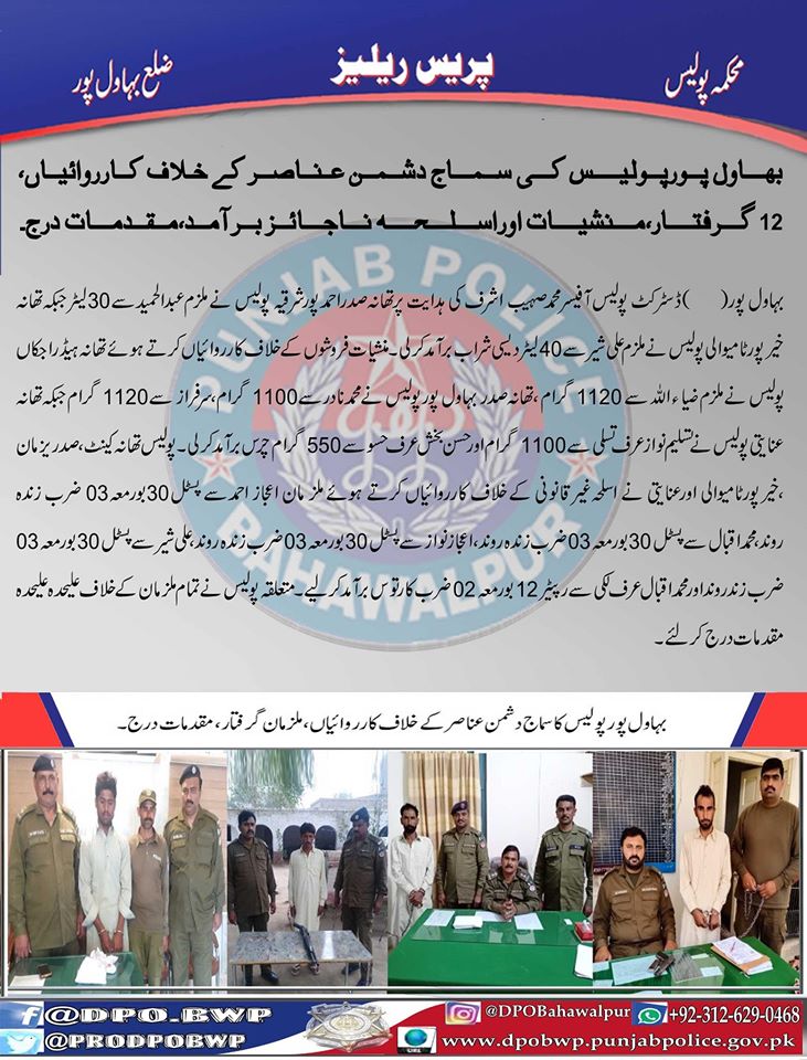بہاولپور پولیس کی سماج دشمن عناصر کے خلاف کارروائیاں 12ملزمان گرفتار منشیات اور اسلحہ ناجائز برآمد ،مقدمات درج۔