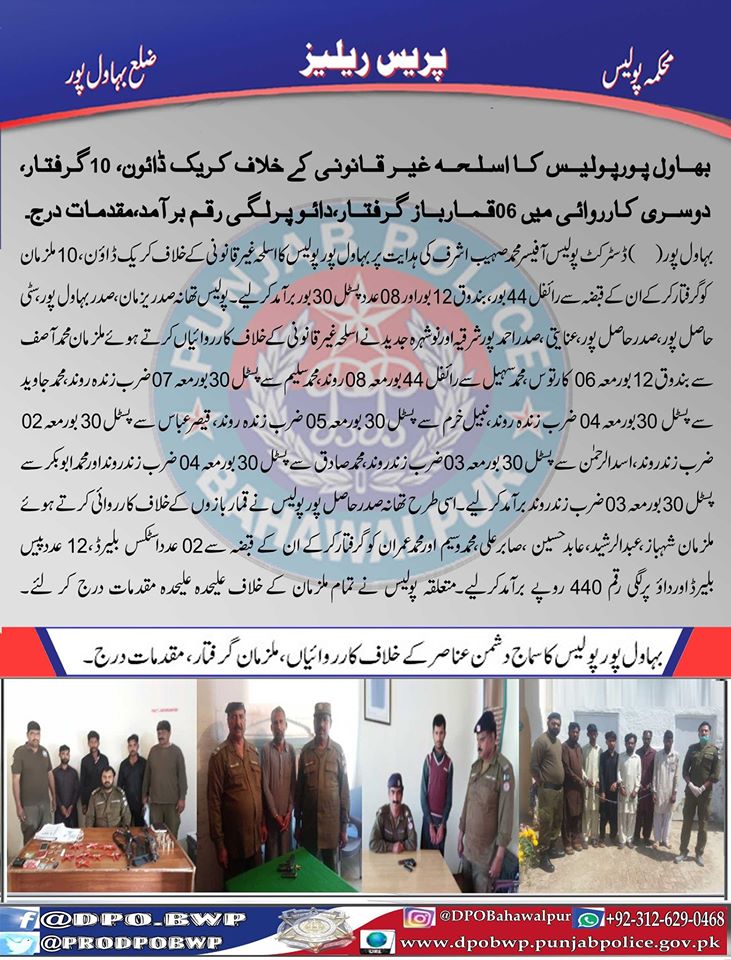 بہاولپور پولیس کا اسلحہ غیرقانونی کے خلاف کریک ڈاؤن، 10 گرفتار ،دوسری کارروائی میں 06قمارباز گرفتار،داؤپر لگہ رقم برآمد ،مقدمات درج۔