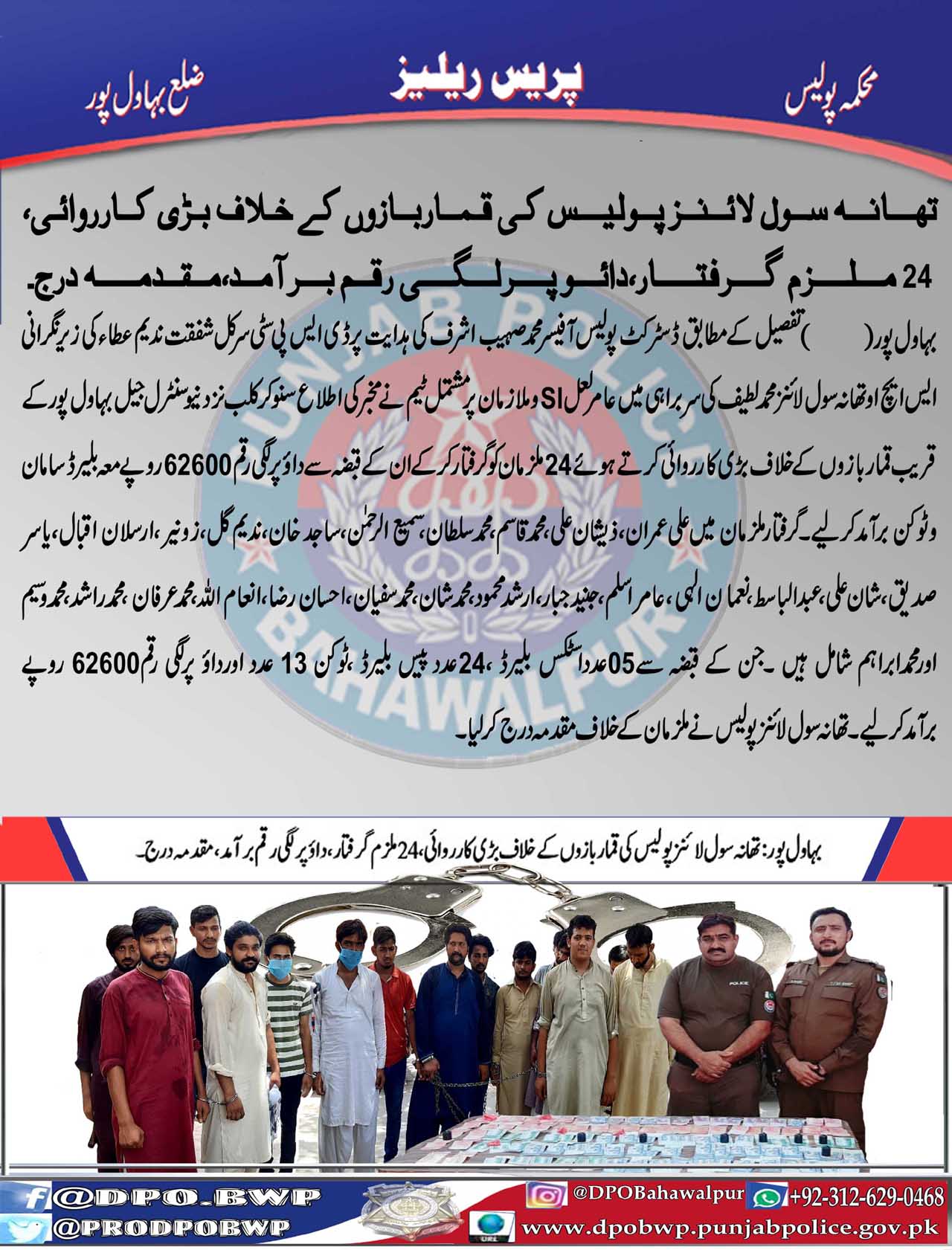 تھانہ سول لائنز پولیس کی قماربازوں کے خلاف بڑی کارروائی، 24ملزمان گرفتار، دائو پر لگی رقم برآمد ، مقدمہ درج