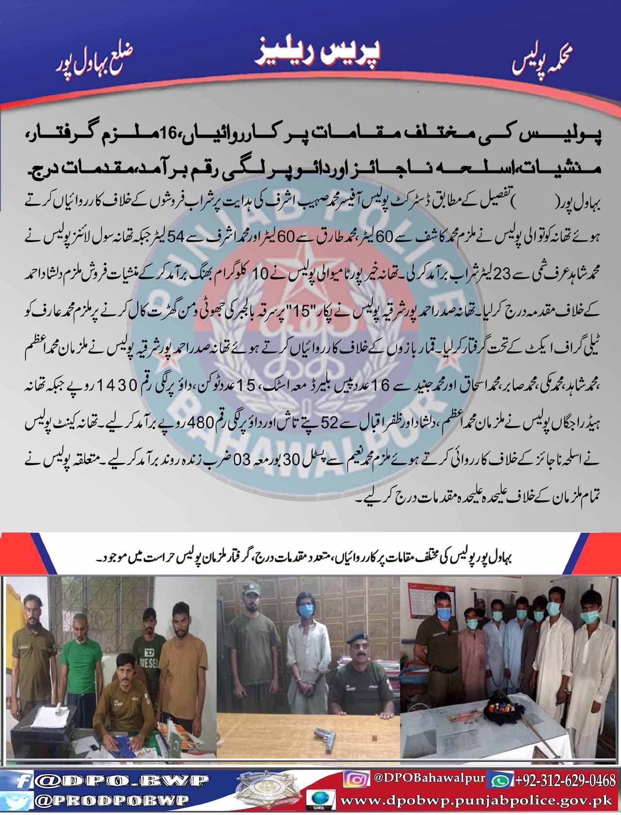 پولیس کی مختلف مقامات پر کارروائیاں ، 16 ملزم گرفتار، منشیات ، اسلحہ ناجائز اور دائو پرلگی تقم برآمد، مقدمات درج