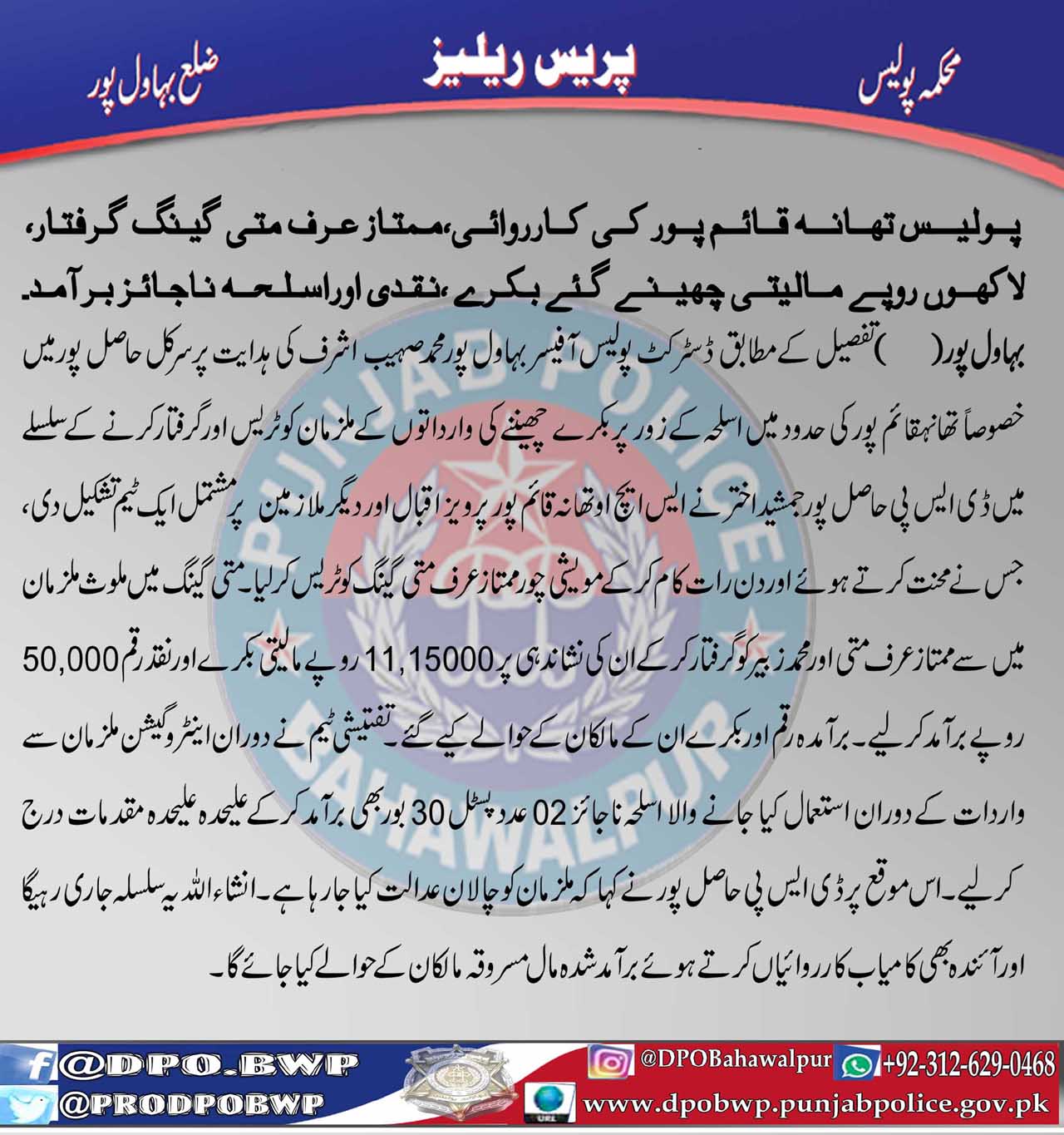 پولیس تھانہ قائم پور کی کارروائی، ممتاز عرف متی گینگ گرفتار، لاکھوں روپے مالیت چھینے گئے بکرے ، نقدی اور اسلحہ ناجائز برآمد۔ ۔