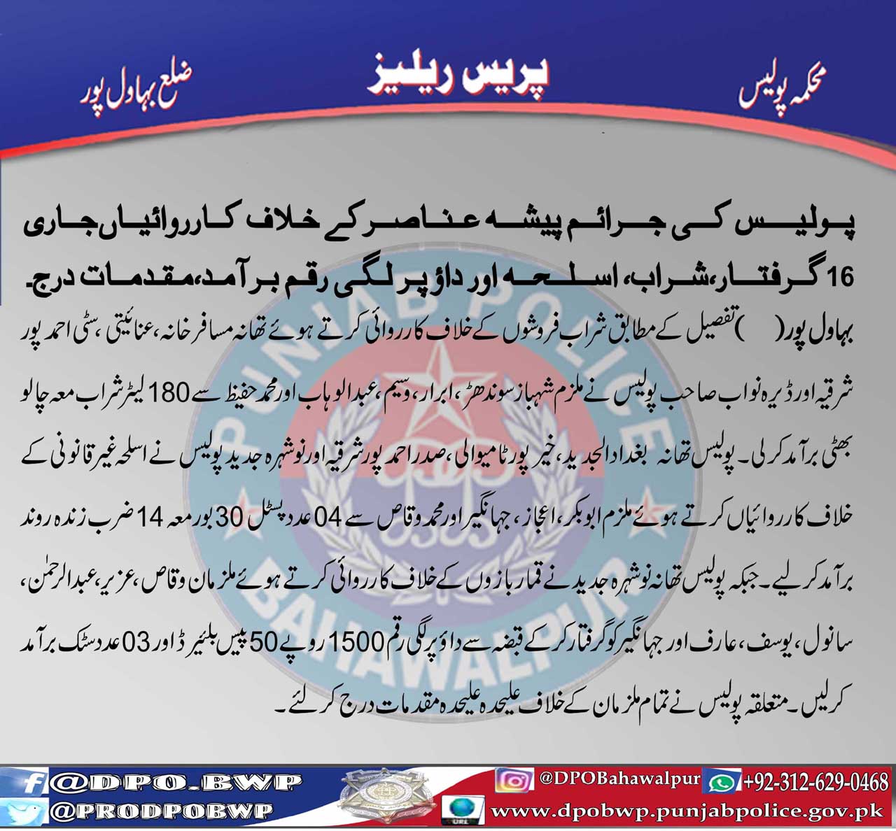پولیس کی جرائم پیشہ عناصر کے خلاف کارروائیاں جاری، 16 گرفتار، شراب ، اسلحہ ناجائز اور دائو پر لگی رقم برآمد ، مقدمات درج