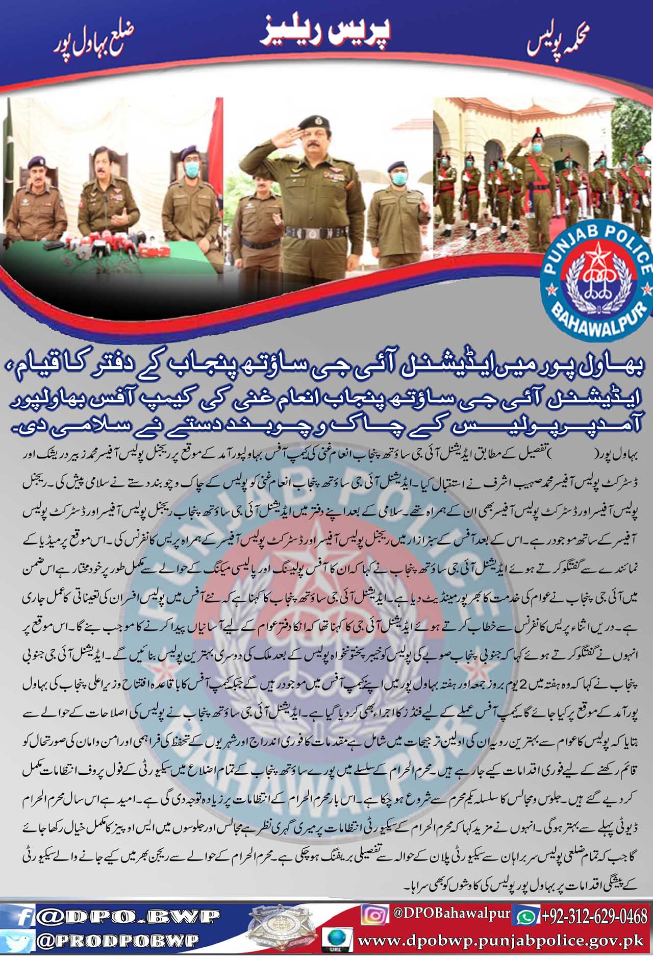 بہاول پور میں ایڈیشنل آئی جی ساؤتھ پنجاب کے دفتر کا قیام ، ایڈیشنل آئی جی ساؤتھ پنجاب انعام غنی کی کیمپ آفس بہاول پور آمد پر پولیس کے چاک و چوبند دستے نے سلامی دی۔