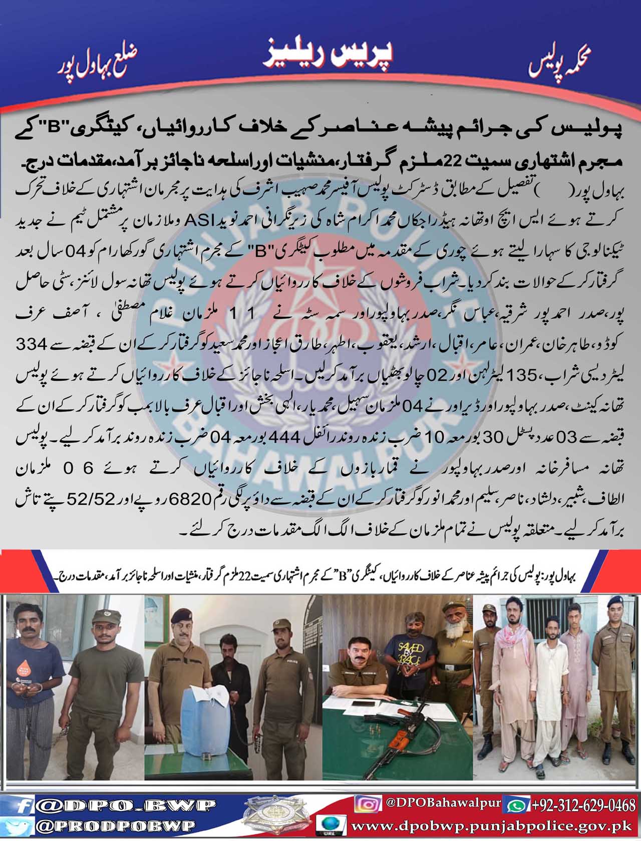 پولیس کی جرائم پیشہ عناصر کے خلاف کارروائیاں، کیٹگری "بی" کے مجرم اشتہاری سمیت 22 ملزم گرفتار، منشیات ، اسلحہ ناجائز اور داؤپر لگر رقم برآمد۔ مقدمات درج