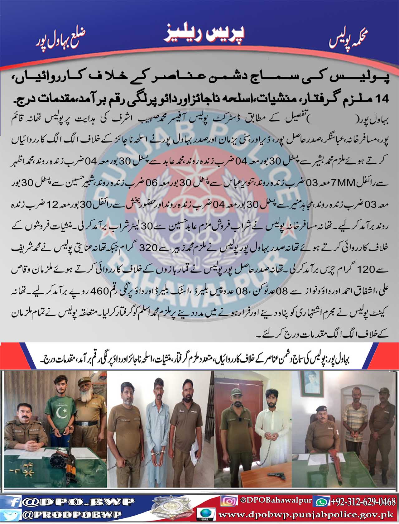 پولیس کی سماج دشمن عناصر کے خلاف کارروائیاں، 14 ملزم گرفتار، منشیات ،اسلھہ ناجائز اور داؤ پر لگی رقم برآمد، ملزمان کے خلاف الگ الگ مقدمات درج۔ ۔
