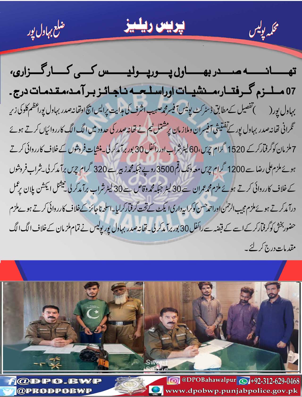 تھانہ صدر بہاول پور پولیس کی کارگزاری ، 07 ملزم گرفتار، منشیات اور اسلحہ ناجائز برآمد ، مقدمات درج۔ ۔ ۔
