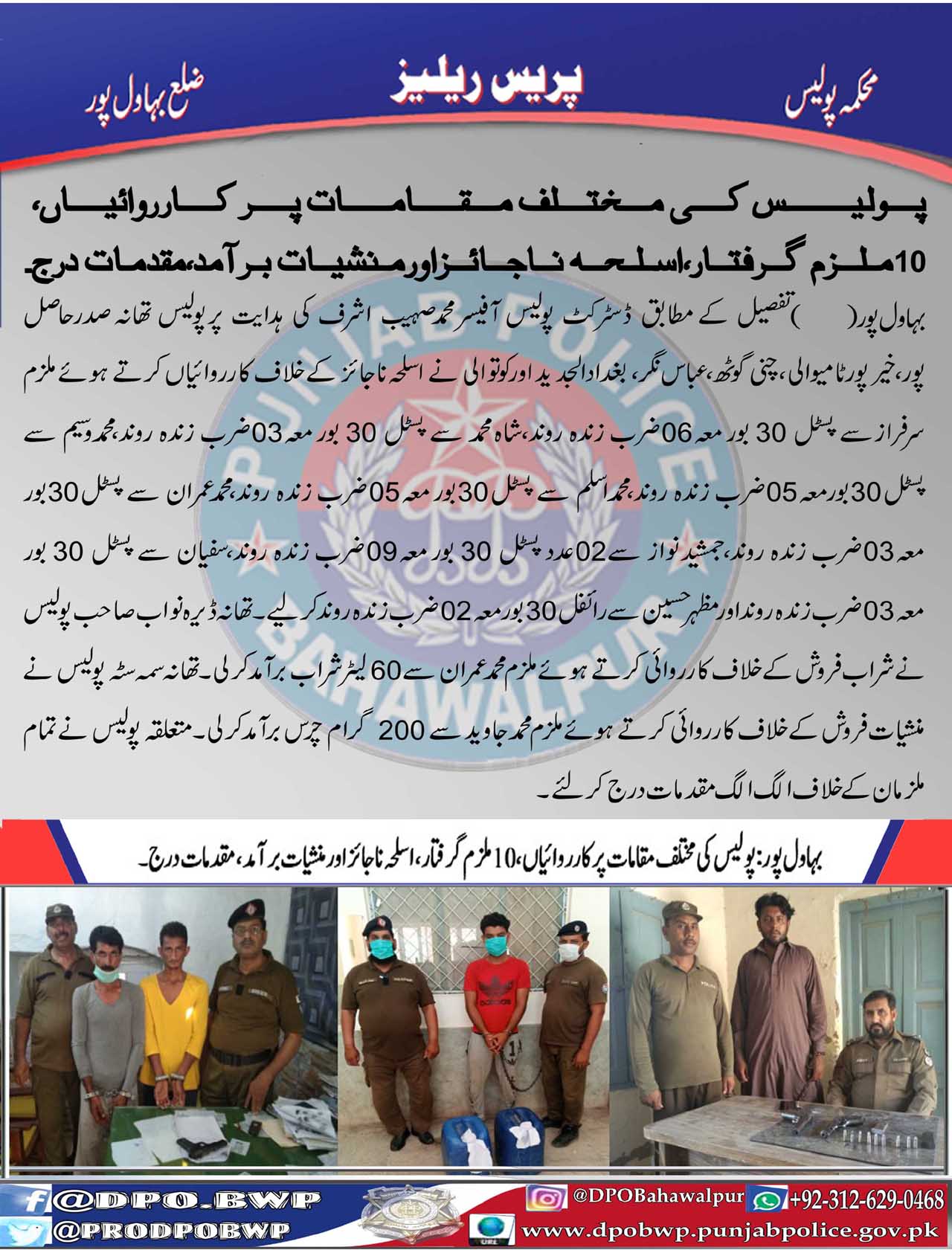 پولیس کی مختلف مقامات پر کارروائیاں، 10ملزم گرفتار، ناجائز اسلحہ اور منشیات برآمد ، مقدمات درج۔ ۔ ۔