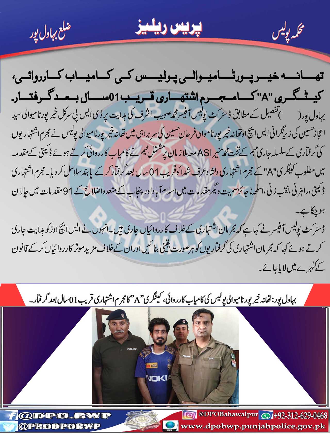 تھانہ خیرپور ٹامیوالی پولیس کی کامیاب کارروائی ،ڈکیتی کے مقدمہ میں مطلوب کیٹگری "اے" کامجرم اشتہاری قریب 01سال بعد گرفتار