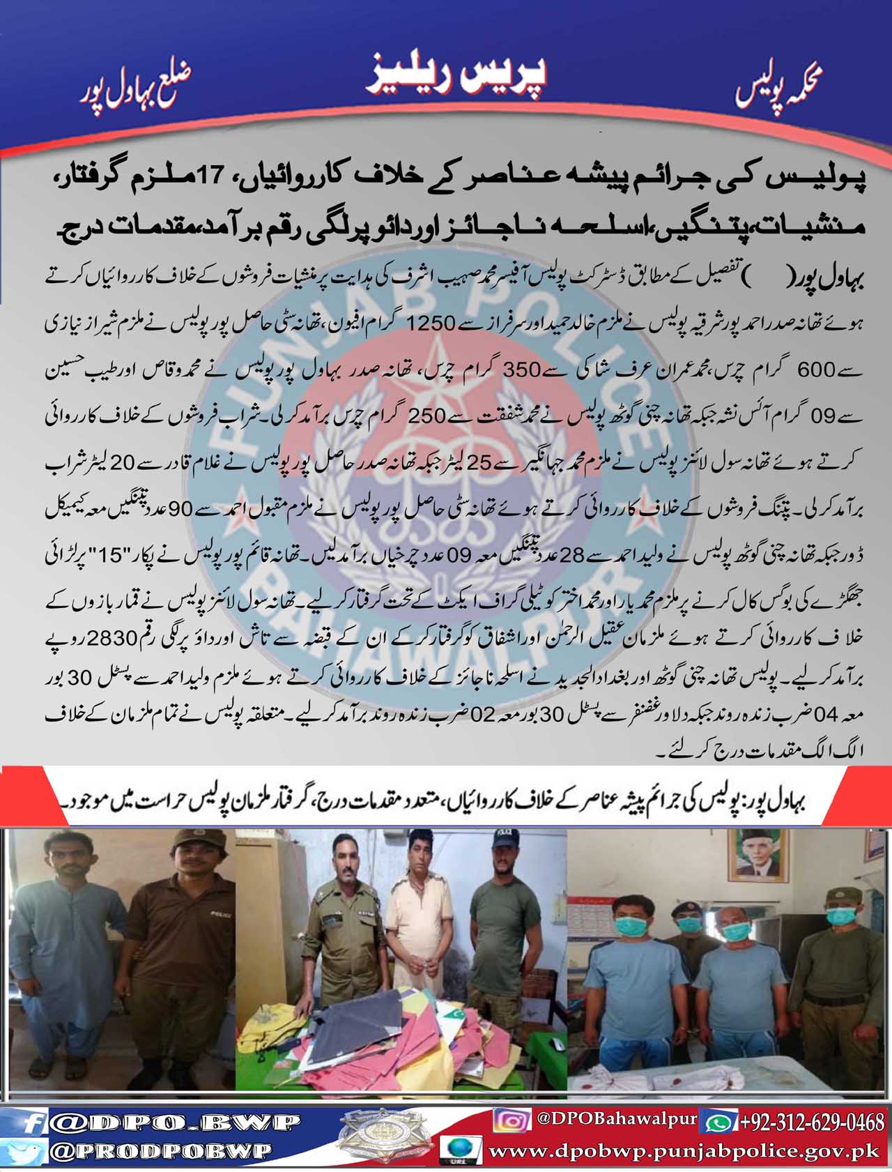پولیس کی جرائم پیشہ عناصر کے خلاف کارروائیاں ، 17 ملزم گرفتار، منشیات ، پتنگیں ، اسلحہ ناجائز اور داؤپر لگی رقم برآمد ، مقدمات درج ۔ ۔ ۔ ۔
