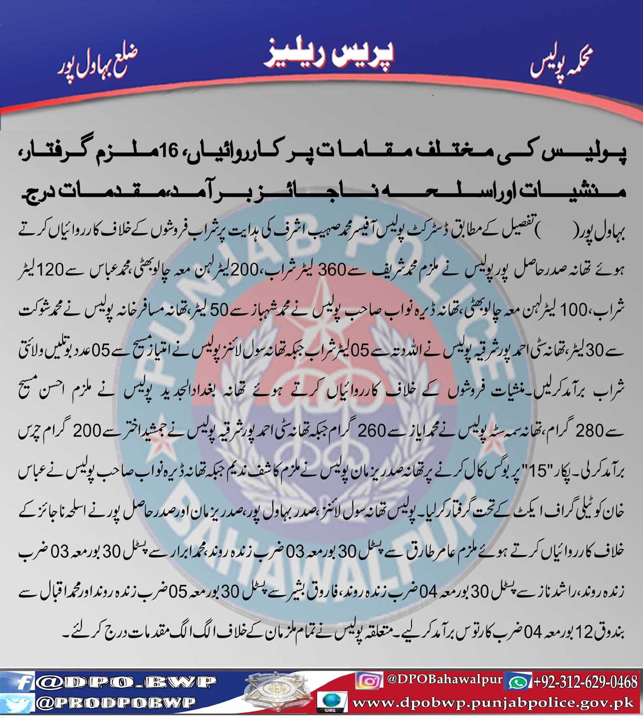 پولیس کی مختلف مقامات پر کارروائیاں، 16 گرفتار، منشیات اور اسلحہ ناجائز برآمد، مقدمات درج۔۔