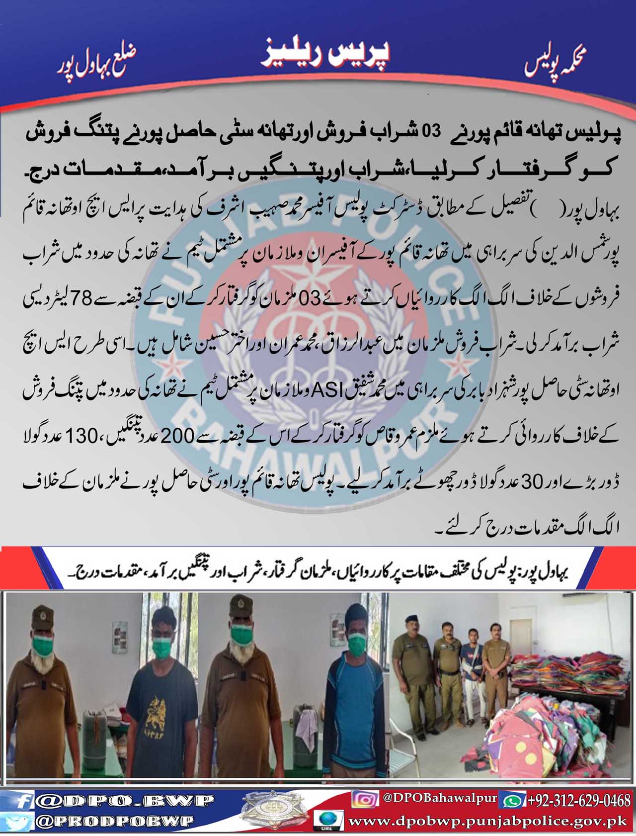 پولیس تھانہ قائم پور نے 03 شراب فروش اور تھانہ سٹی حاصل پور نے پتنگ فروش کو گرفتار کرلیا، شراب اور پتنگیں برآمد ، مقدمات درج۔ ۔