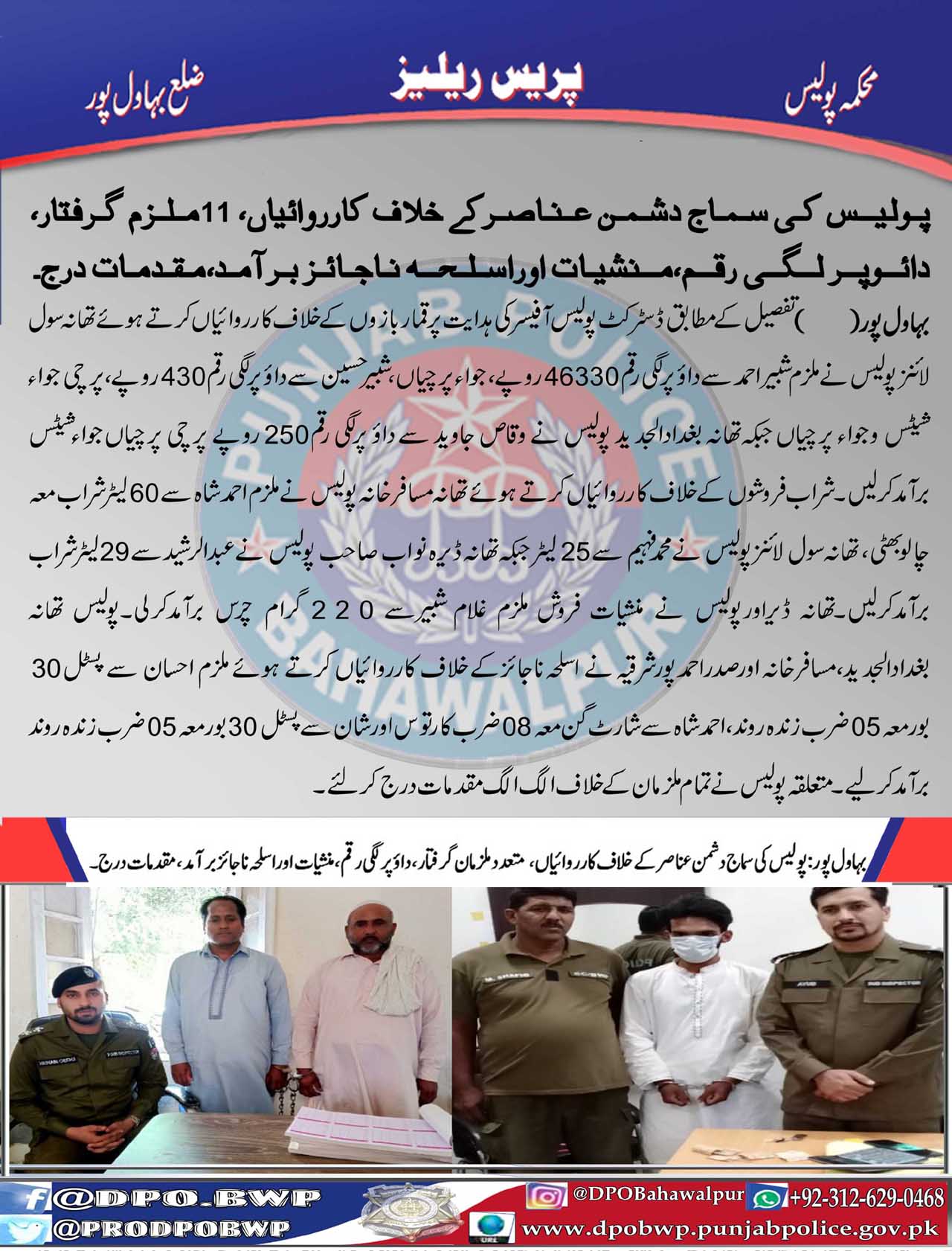 پولیس کی سماج دشمن عناصر کے خلاف کارروائیاں، 11 ملزم گرفتار، ، داؤ پر لگی رقم ، منشیات اور اسلحہ ناجائز برآمد، مقدمات درج۔ ۔ ۔