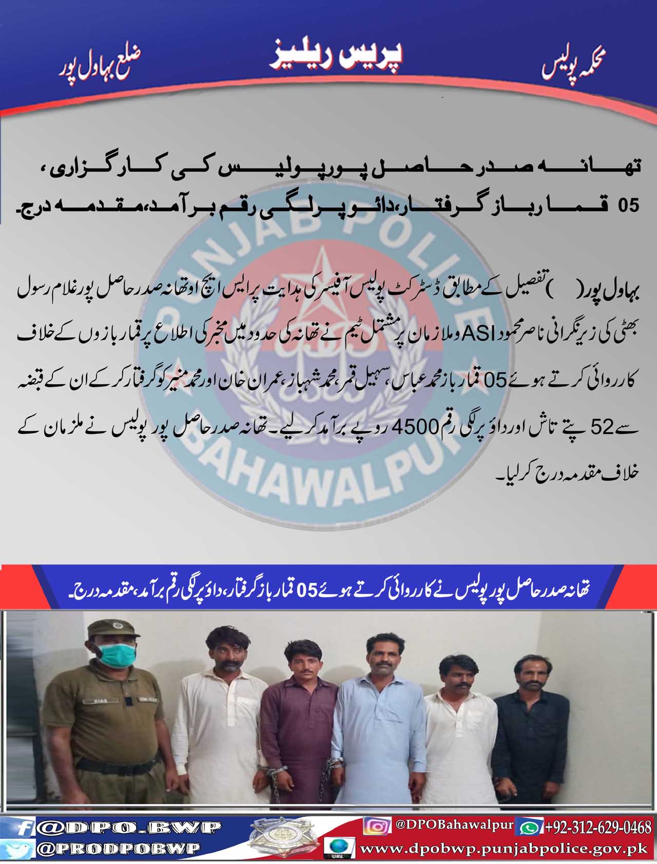 تھانہ صدر حاصل پور پولیس کی کارروائی ، 05قمار باز گرفتار، داؤ پر لگی رقم برآمد ، مقدمہ درج۔ ۔ ۔