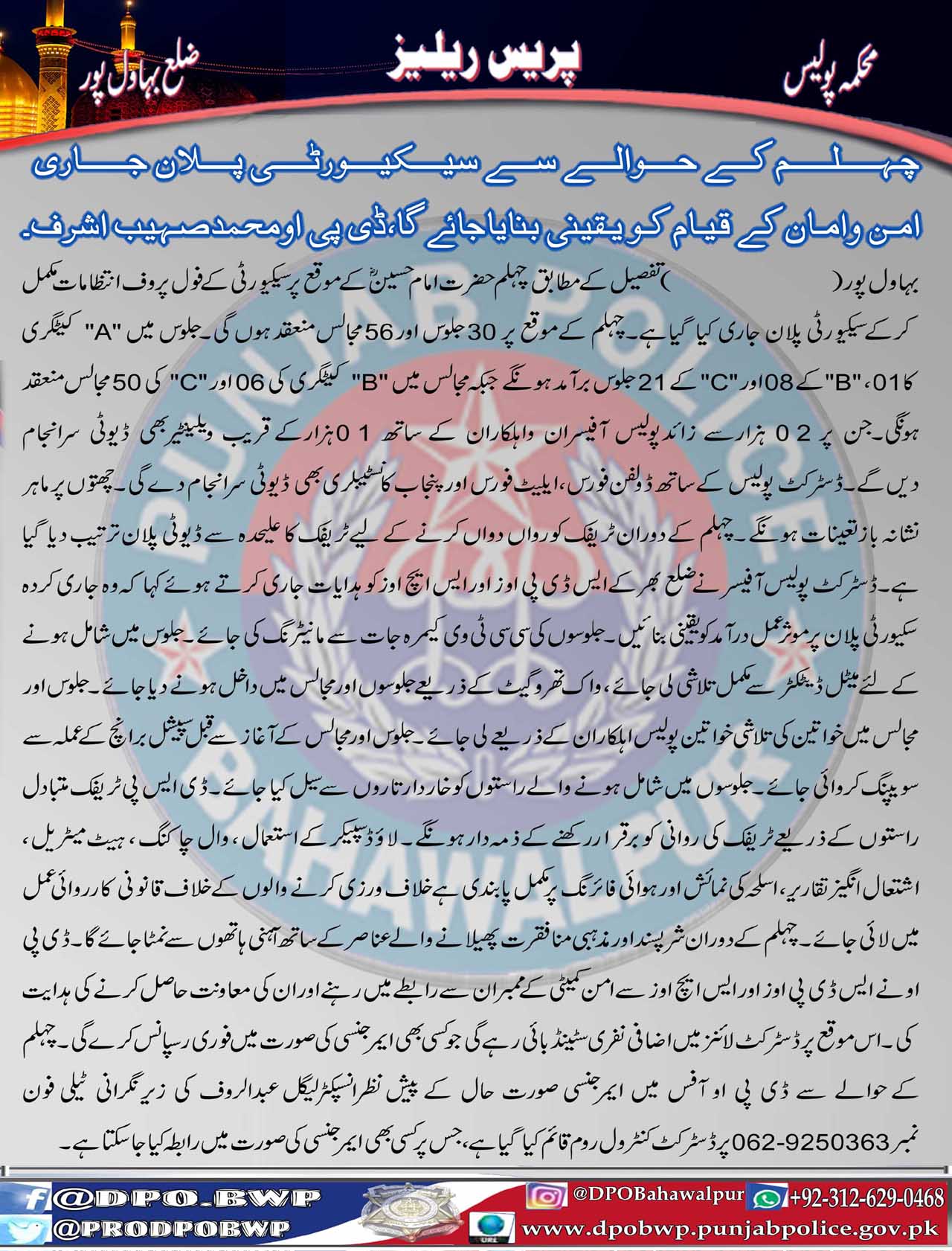 چہلم کے حوالے سے سیکیورٹی پلان جاری ، امن و امان کے قیام کو یقینی بنایا جائے گا، ڈسٹرکٹ پولیس آفیسر محمد صہیب اشرف