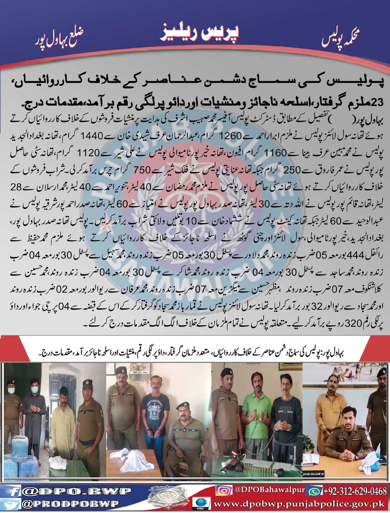 پولیس کی سماج دشمن عناصر کے خلاف کارروائیاں، 23ملزم گرفتار، اسلحہ ناجائز و منشیات اور داؤ پر لگی رقم برآمد، ملزمان کے خلاف الگ الگ مقدمات درج۔