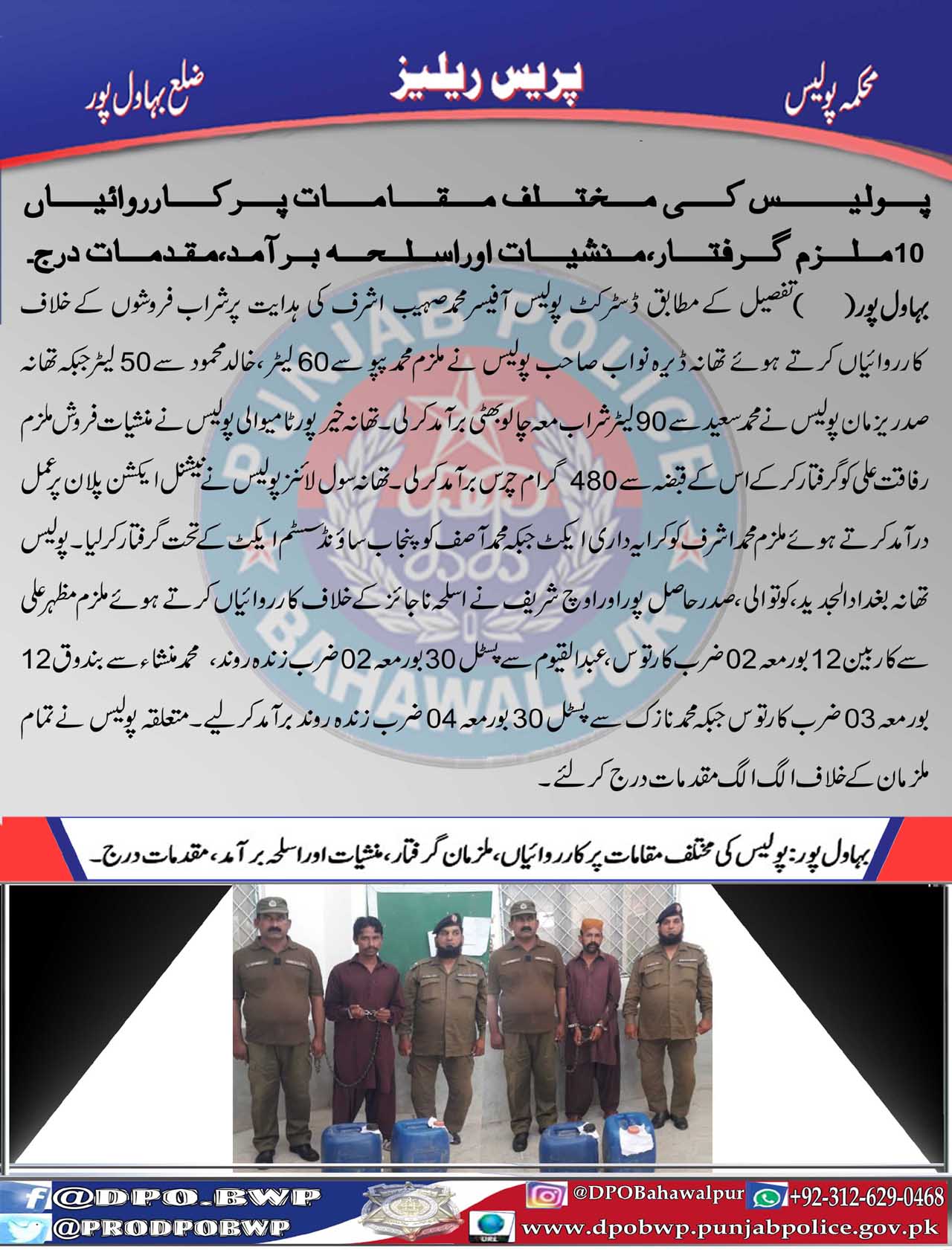 پولیس کی مختلف پر کارروائیاں10ملزم گرفتار ، منشیات اور اسلحہ برآمد، مقدماتدرج۔ ۔
