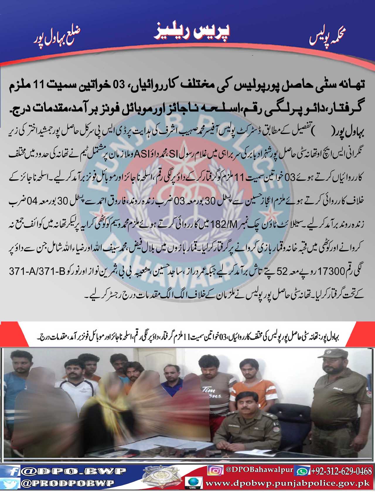 تھانہ سٹی حاصل پور پولیس کی مختلف کارروائیاں، 03 خواتین سمیت 11 ملزم گرفتار، داؤ پر لگی رقم ، موبائل فون اور اسلحہ ناجائز برآمد ، مقدمات درج۔ ۔