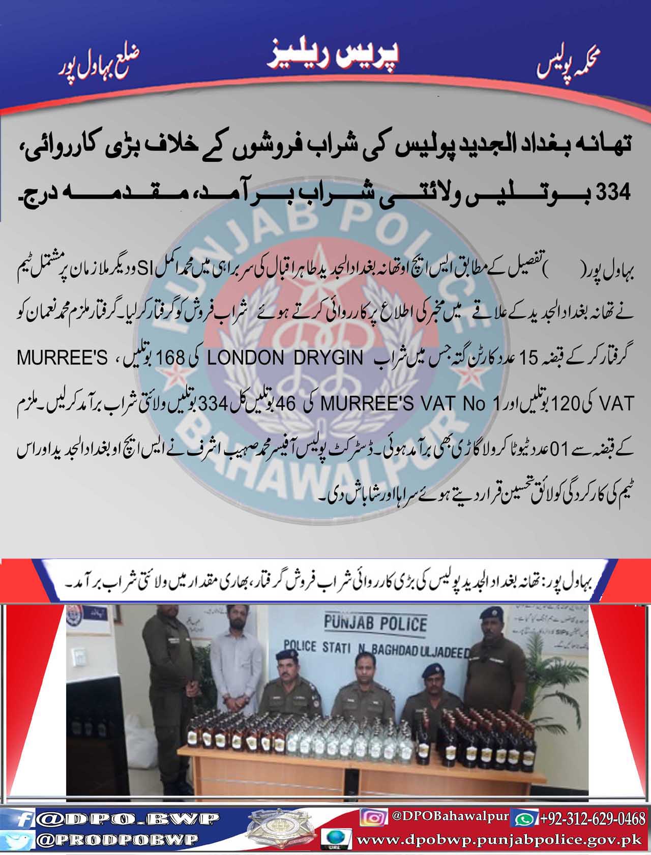 تھانہ بغداد الجدید پولیس کی شراب فروشوں کے خلاف بڑی کارروائی، 334 بوتلیں ولائتی شراب برآمد ، مقدمہ درج۔ ۔ ۔