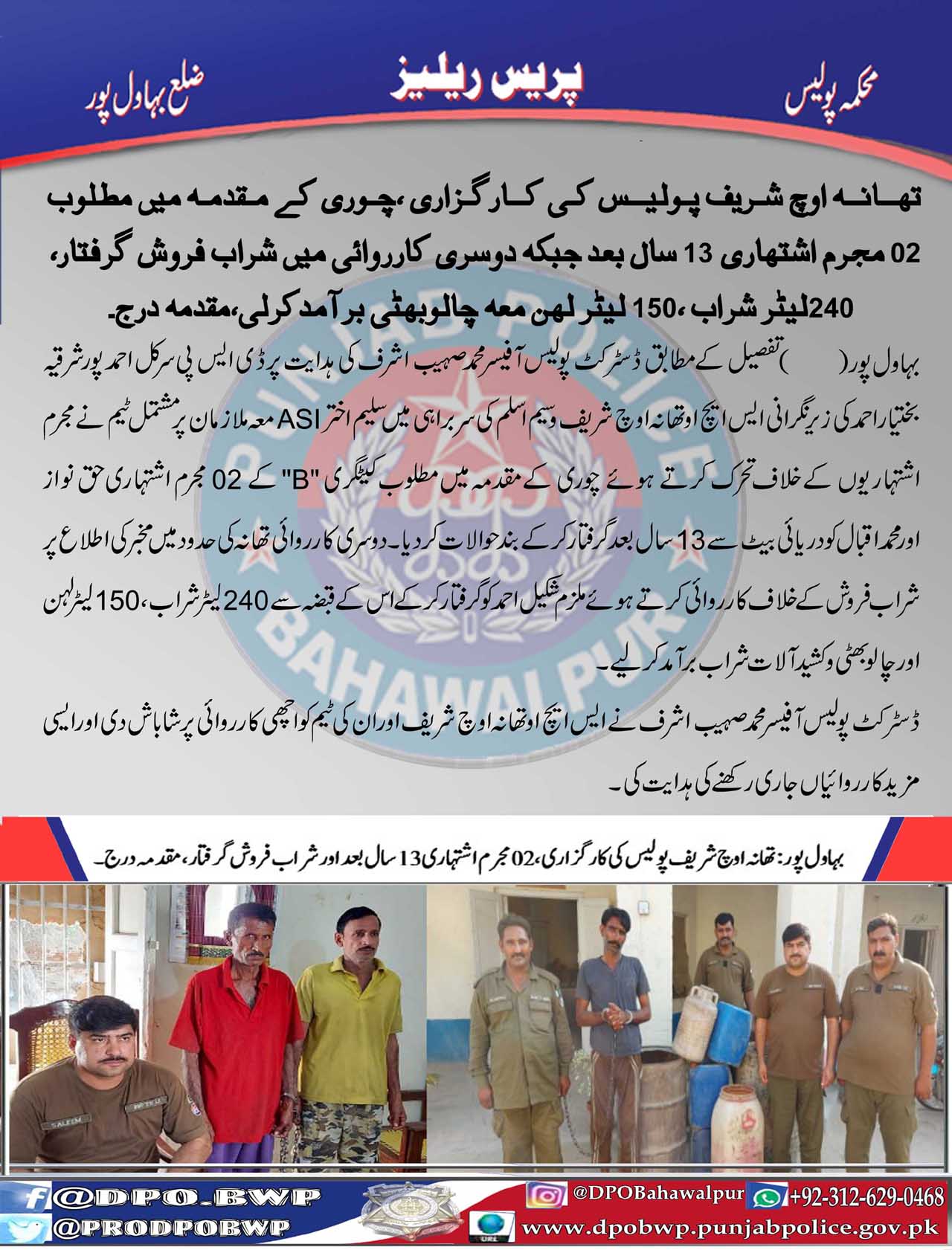 تھانہ اوچ شریف پولیس کی کارگزاری، چوری کے مقدمہ میں مطلوب 02مجرم اشتہاری 13سال بعد جبکہ دوسری کارروائی میں شراب فروش ، 240لیٹر شراب 150لیٹر لہن معہ چالوں بھٹی برآمد کرلی مقدمہ درج۔ ۔ ۔
