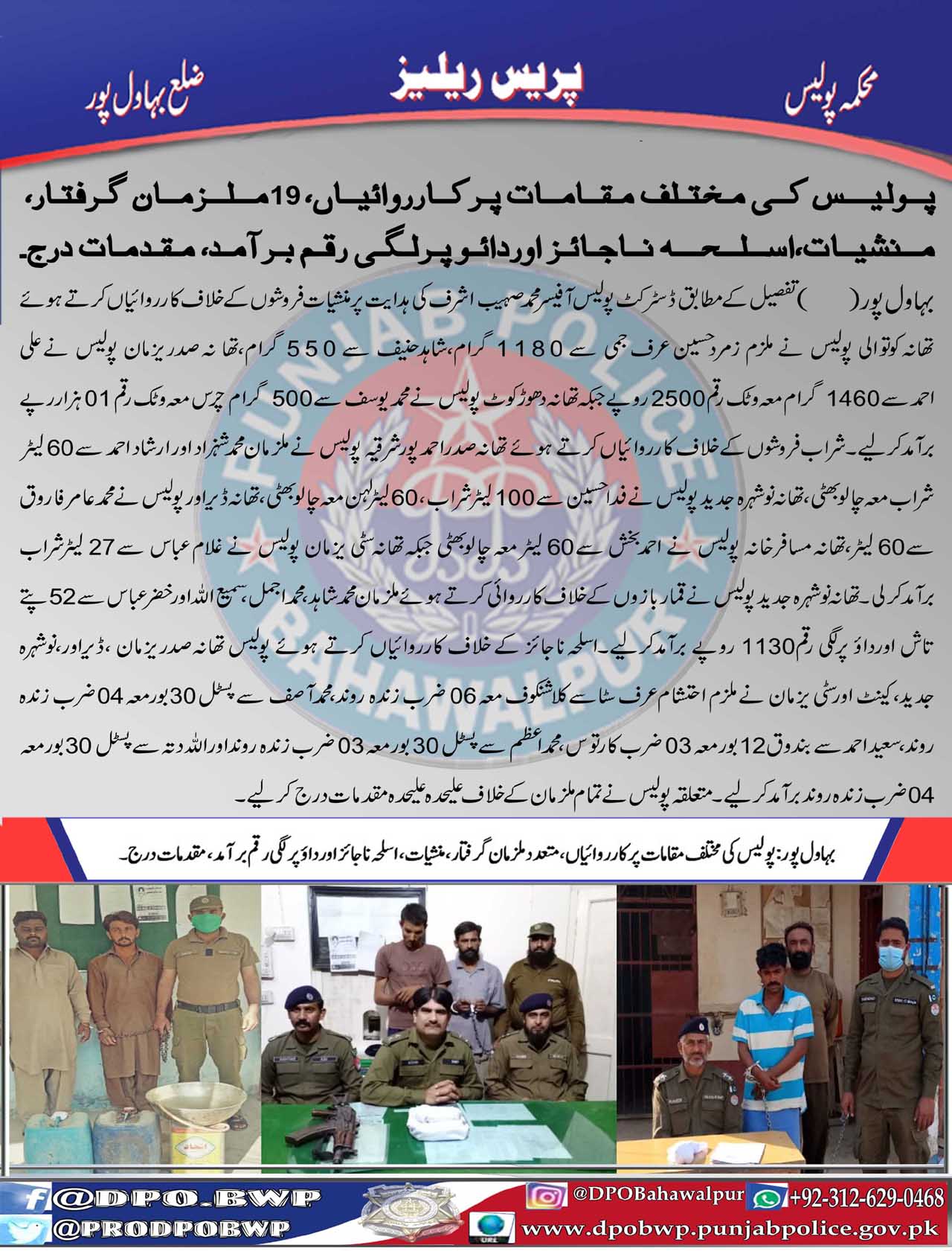 پولیس کی مختلف مقامات پر کارروائیاں، 19 ملزمان گرفتار، منشیات ، اسلحہ ناجائز اور داؤ پر لگی رقم برآمد، مقدمات درج۔۔ ۔