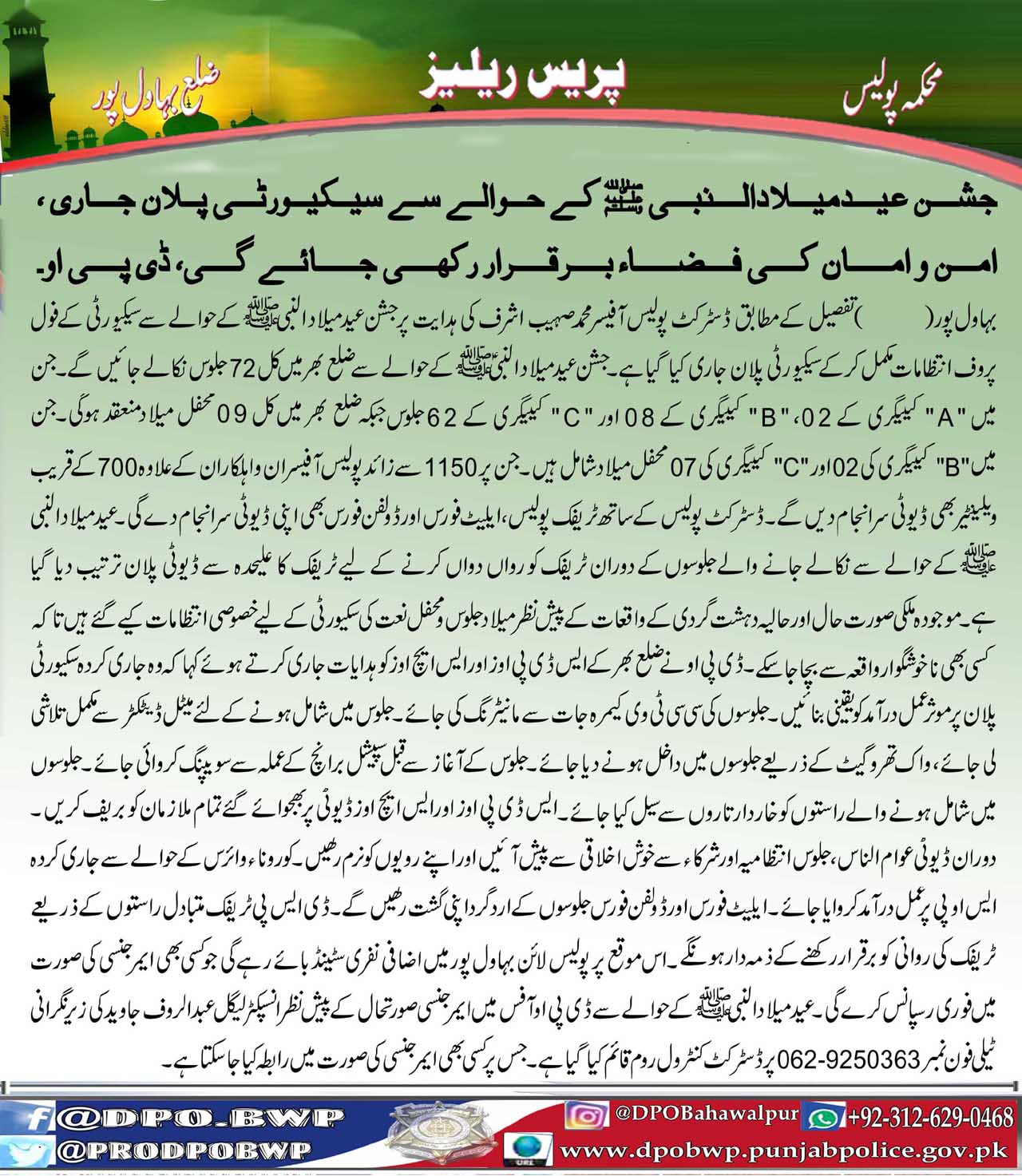 جشن عید میلاد النبی صلی اللہ علیہ وسلم کے حوالے سے سیکیورٹی پلان جاری ، امن و امان کی فضائ برقرار رکھی جائے گی ڈسٹرکٹ پولیس آفیسر۔۔