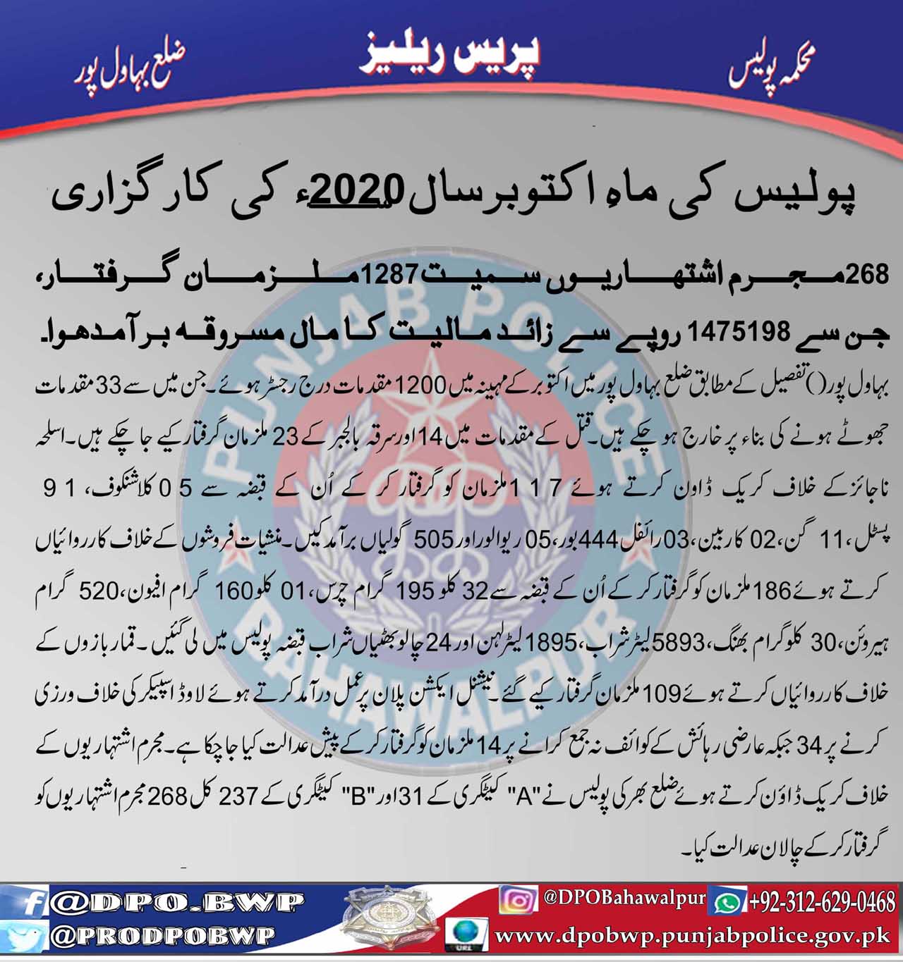 پولیس کی ماہِ اکتوبر سال 2020ء کی کارگزاری ،268مجرم اشتہاریوں سیت 1287 ملزمان گرفتار، جن سے لاکھوں روپے سے زائد مالیت کا مال مسروقہ برآمدہوا۔ ۔ ۔