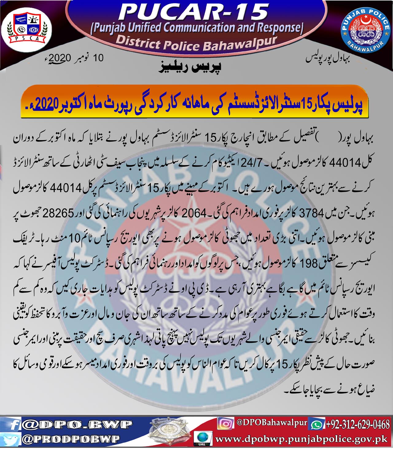 پولیس پکار 15 سنٹرالائزڈ سسٹم کی ماہانہ کاکردگی رپورٹ بابت ماہ اکتوبر2020ء