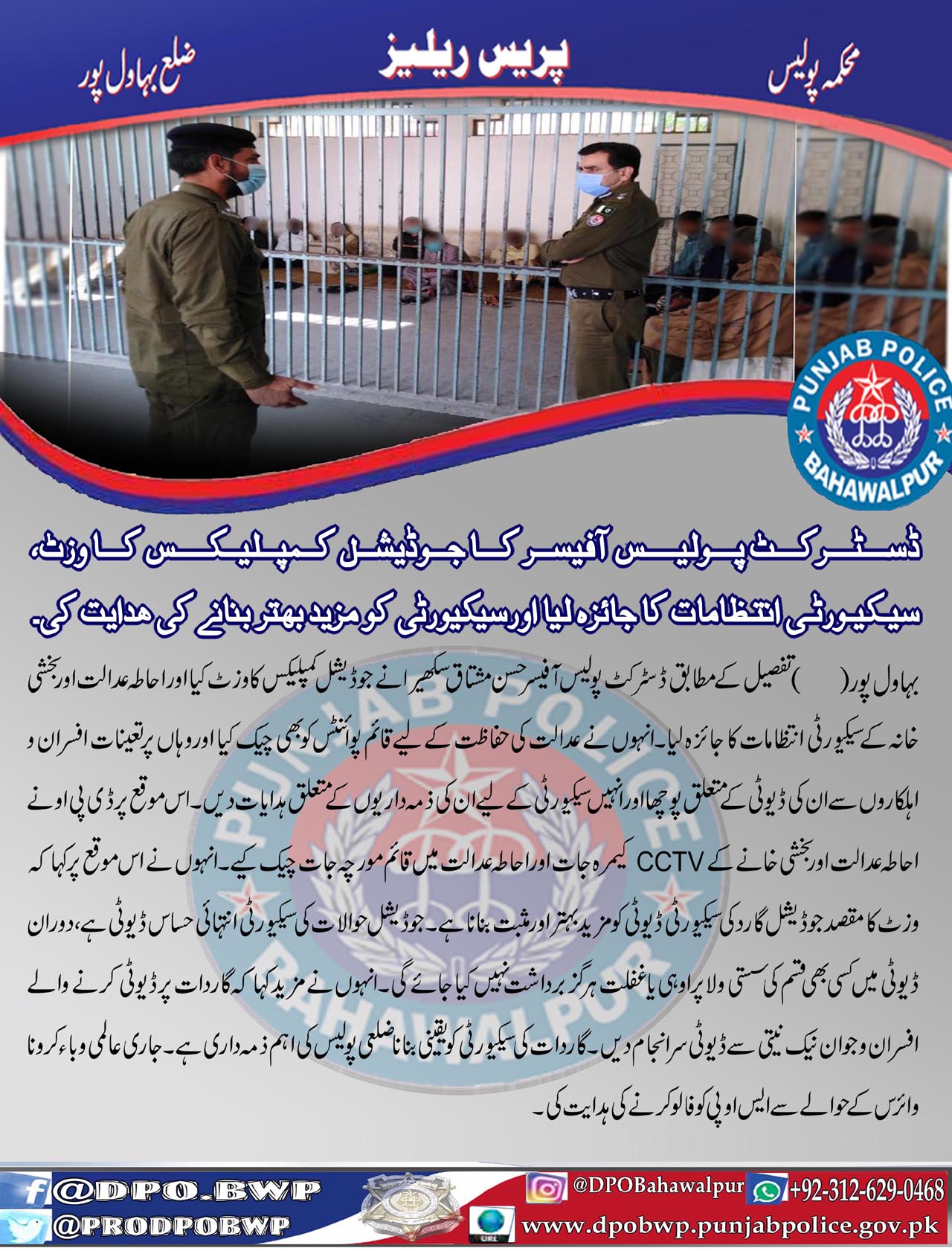 ڈسٹرکٹ پولیس آفیسر کا جوڈیشل کمپلیکس کا وزٹ ، سیکیورٹی انتظامات کا جائزہ لیا اور سیکیورٹی کو مزید بہتر بنانے کی ہدایت کی۔
