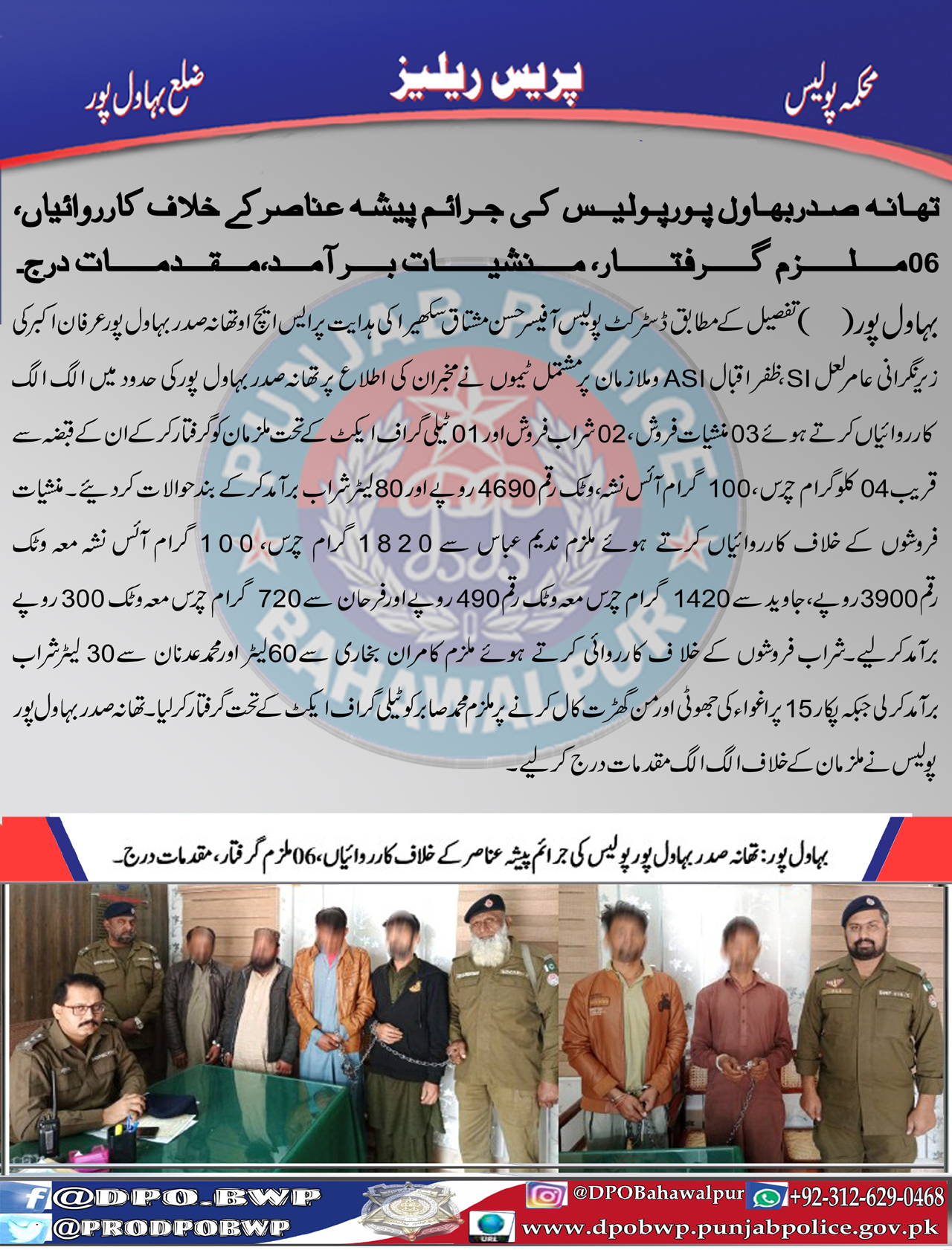 تھانہ صدر بہاول پور پولیس کی جرائم پیشہ عناصر کے خلاف کارروائیاں، 06 ملزمان گرفتار ، منشیات برآمد ، مقدمات درج۔