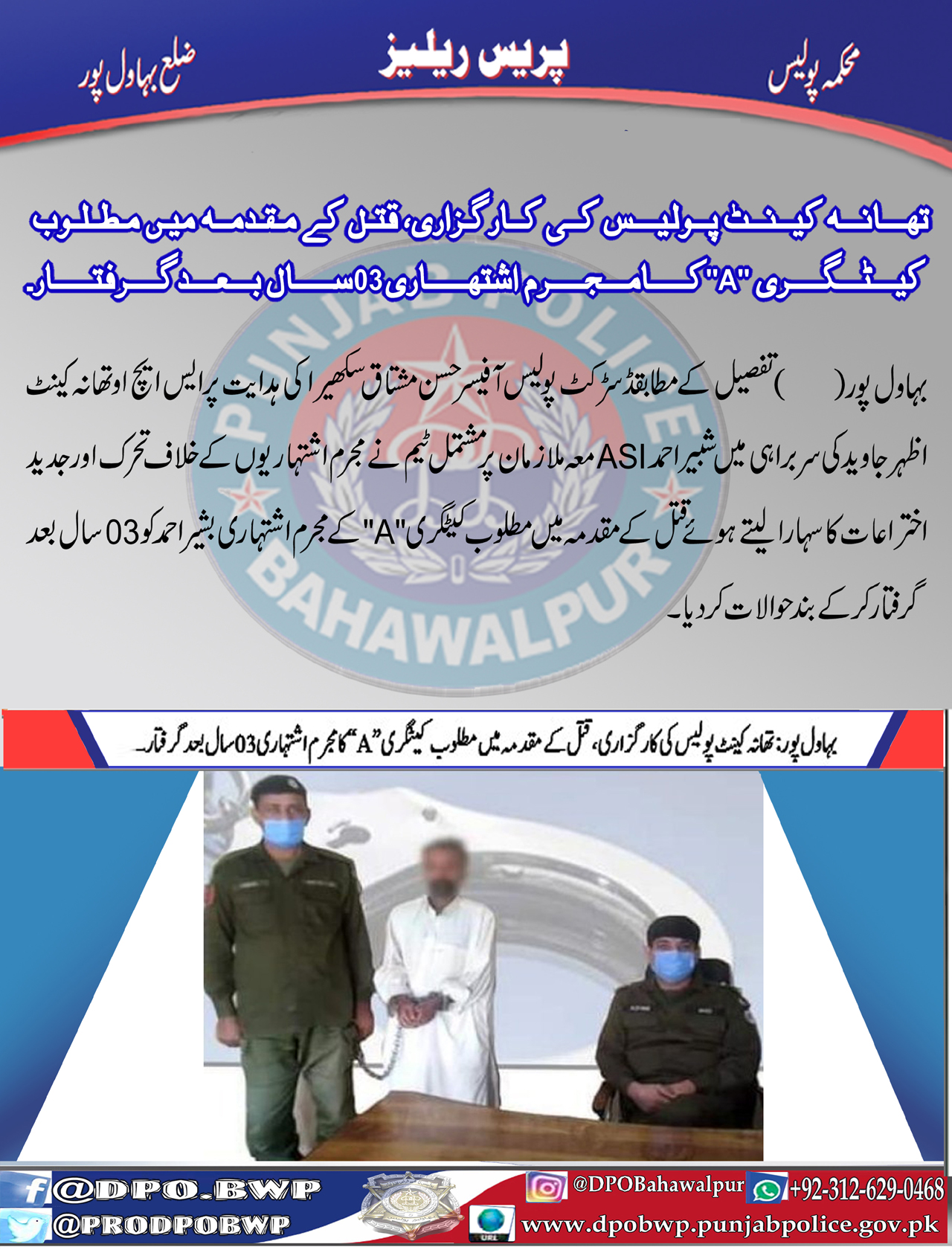 تھانہ کینٹ پولیس کی کاراگزاری ، قتل کے مقدمہ میں مطلوب کیٹگری "اے " کا مجرم اشتہاری 03 سال بعد گرفتار۔ ۔ ۔
