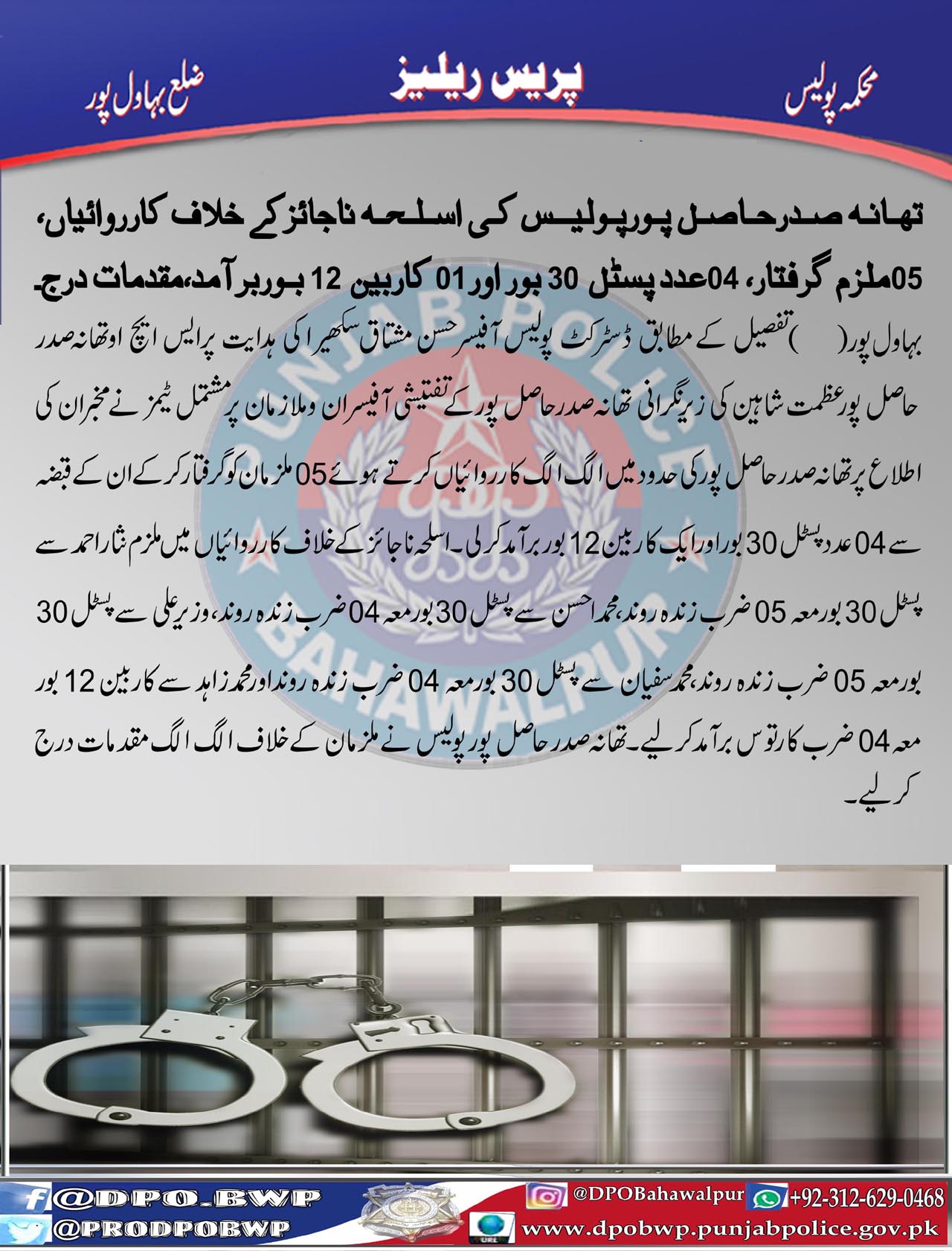تھانہ صدر حاصل پور پولیس کی اسلحہ ناجائز کے خلاف کارروائیاں، 05 ملزم گرفتار، 04 عدد پسٹل 30بور اور 01 کاربین 12 بور برآمد، مقدمات درج۔ ۔