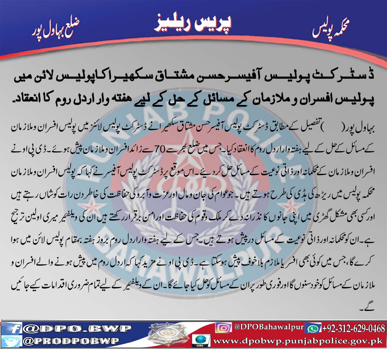 ڈسٹرکٹ پولیس آفیسر حسن مشتاق سکھیرا کا پولیس لائن میں پولیس افسران و ملازمان کے مسائل کے حل کے لیے ہفتہ وار اردل روم کا انعقاد۔ ۔