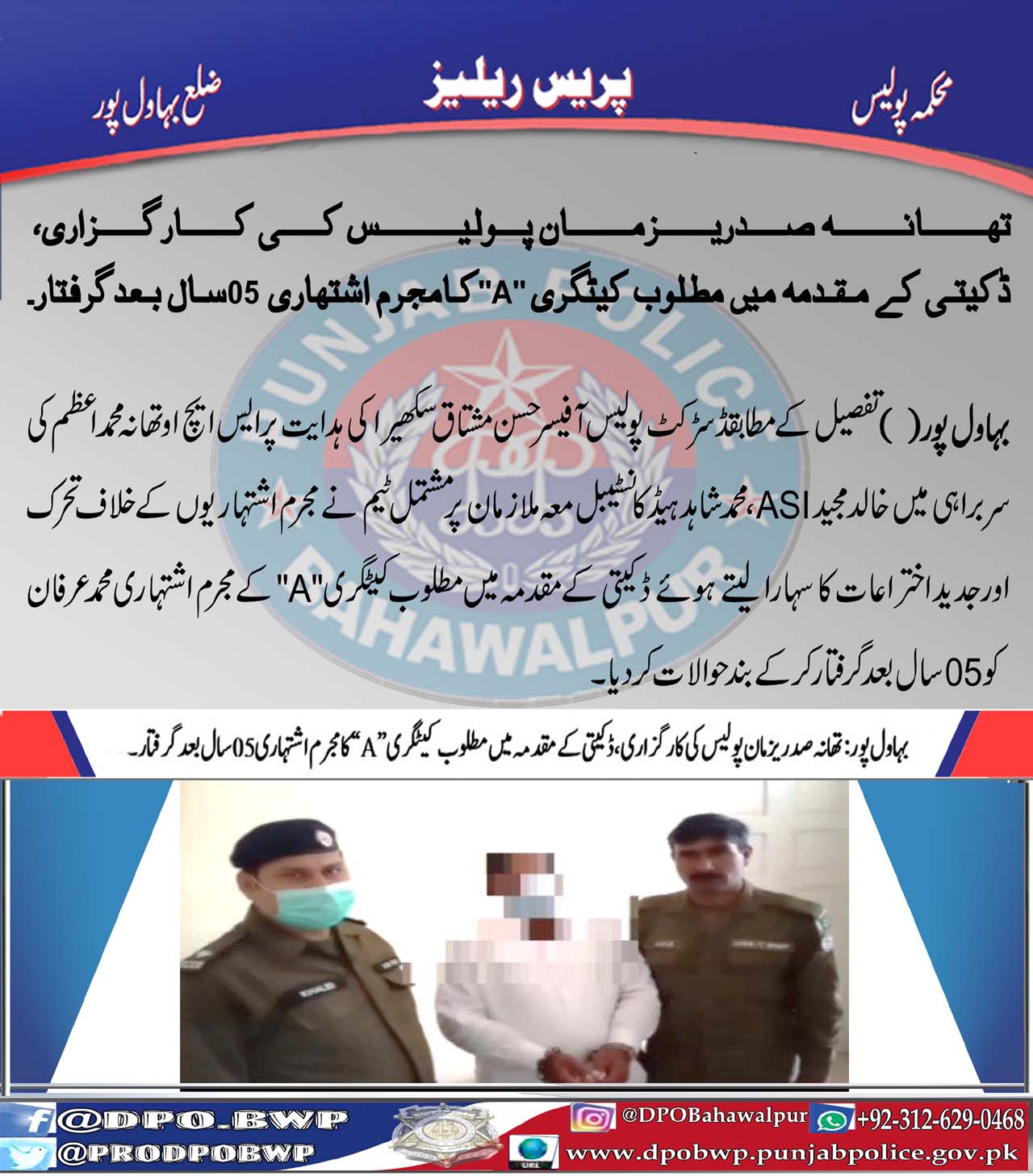 تھانہ صدر یزمان پولیس کی کاررگزاری ،ڈکیتی کے مقدمہ میں مطلوب کیٹگری "اے" کا مجرم اشتہاری 05سال بعد گرفتار۔ ۔