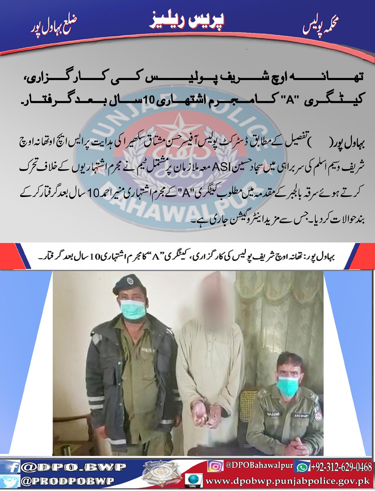 تھانہ اوچ شریف پولیس کی کارروائی، کیٹگری "اے" کامجرم اشتہاری 10سال بعد گرفتار۔