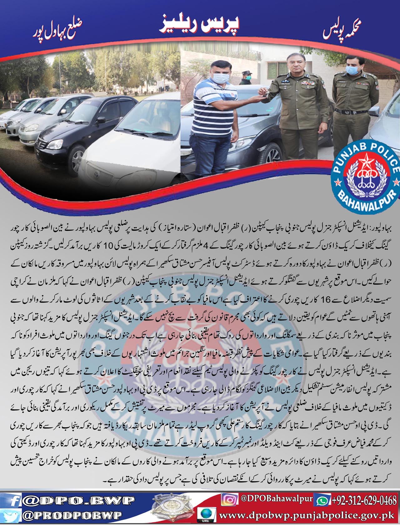 بہاول پور :۔ ایڈیشنل انسپکٹر جنرل پولیس جنوبی پنجاب کیپٹن (ر) ظفر اقبال اعوان (ستارہ امتیاز) کی ہدایت پر ضلعی پولیس نے بین الصوبائی کار چور گینگ کے خلاف کریک ڈاؤن کرتے ہوئے 04 ملزم گرفتارکرکے کروڑوں روپے مالیت کی 10کاریں برآمد کرلی۔۔