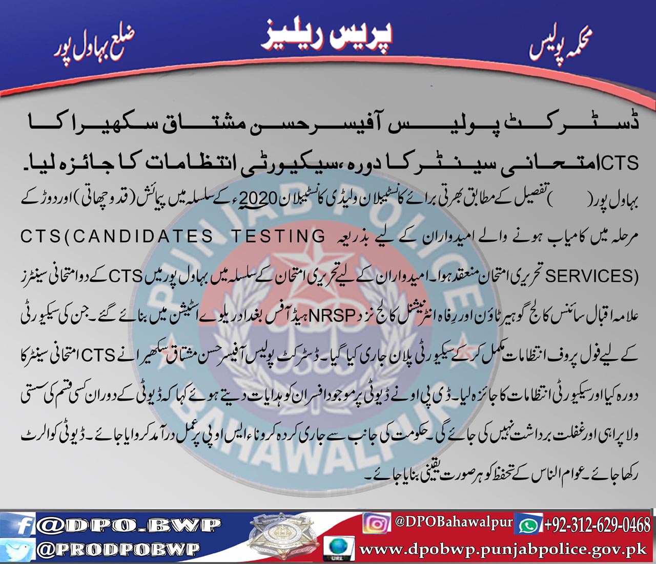 ڈسٹرکٹ پولیس آفیسر حسن مشتاق سکھیرا کا سی ٹی ایس امتحانی سینٹر کا دورہ ، سیکیورٹی انتظامات کا جائزہ لیا۔
