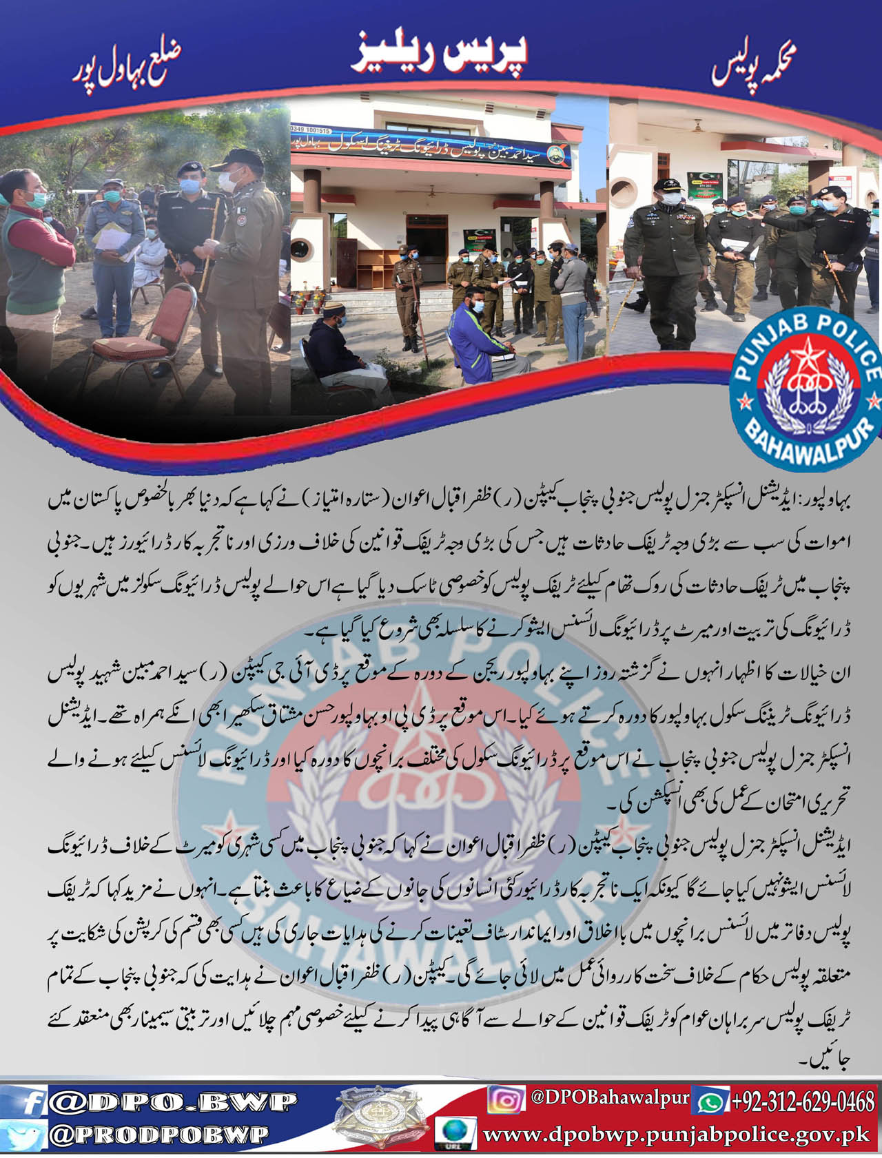 بہاول پور : ایڈیشنل انسپکٹر جنرل پولیس جنوبی پنجاب کیپٹین (ر) ظفر اقبال اعوان کا ڈسٹرکٹ پولیس آفیسر حسن مشتاق سکھیرا کے ہمراہ سید احمدمبین شہید پولیس ڈرائیونگ ٹریننگ اسکول کا وزٹ۔