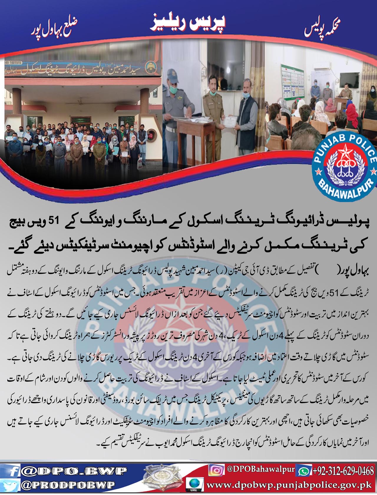 پولیس ڈرائیونگ ٹریننگ اسکول کے مارننگ و ایوننگ کے 51 ویں بیج کی ٹریننگ مکمل کرنے پوالے اسٹوڈنٹ کو اچیومنٹ سرٹیفکیٹس دیئے گئے۔۔