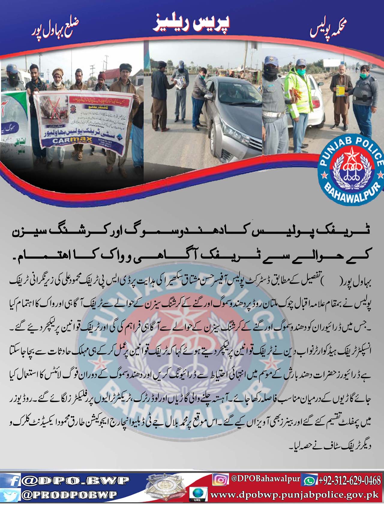 ٹریفک پولیس کا دھند و سموگ اور کرشنگ سیزن کے حوالے سے ٹڑیفک آگاہی و واک کا اہتمام