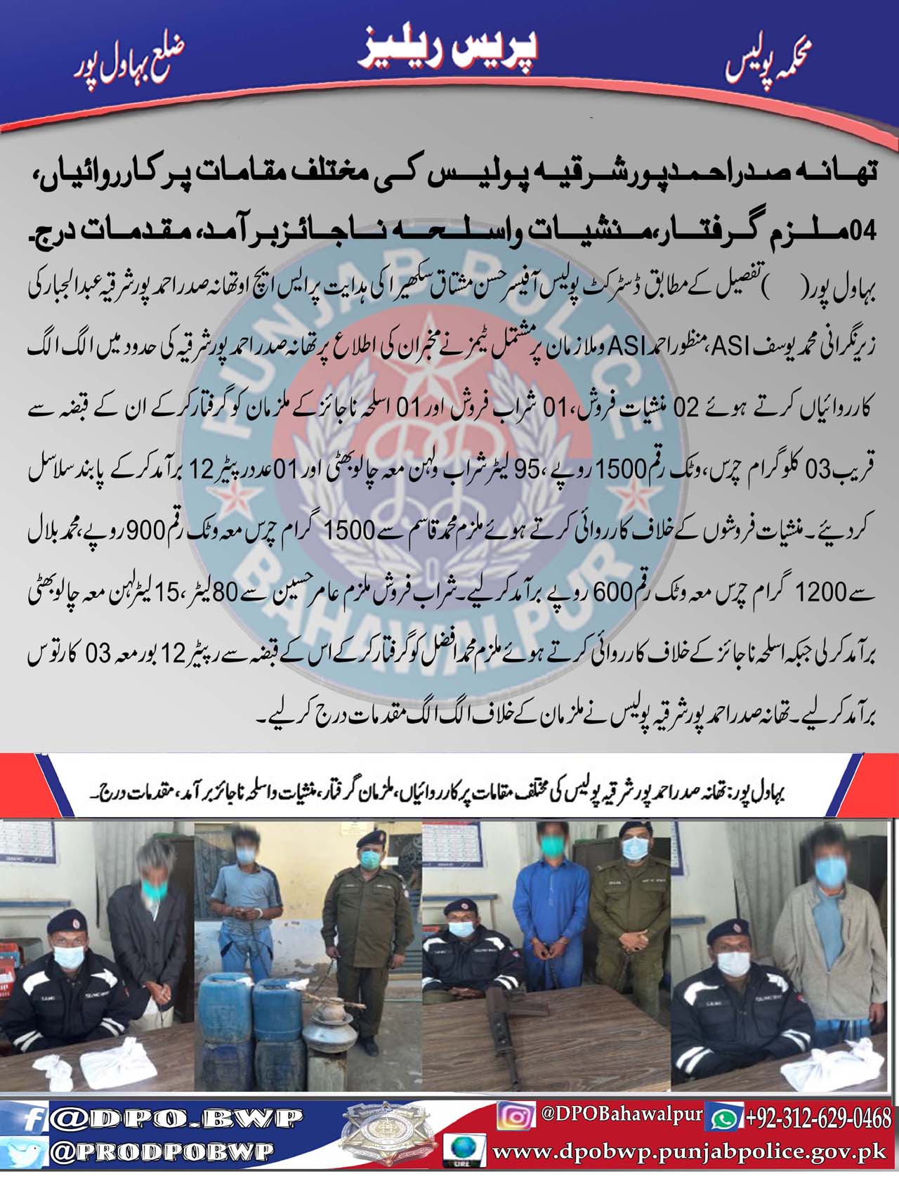 تھانہ صدر احمد پور شرقیہ پولیس کی مختلف مقامات پر کارروائیاں، 04ملزم گرفتار، منشیات و اسلحہ ناجائز برآمد، مقدمات درج۔