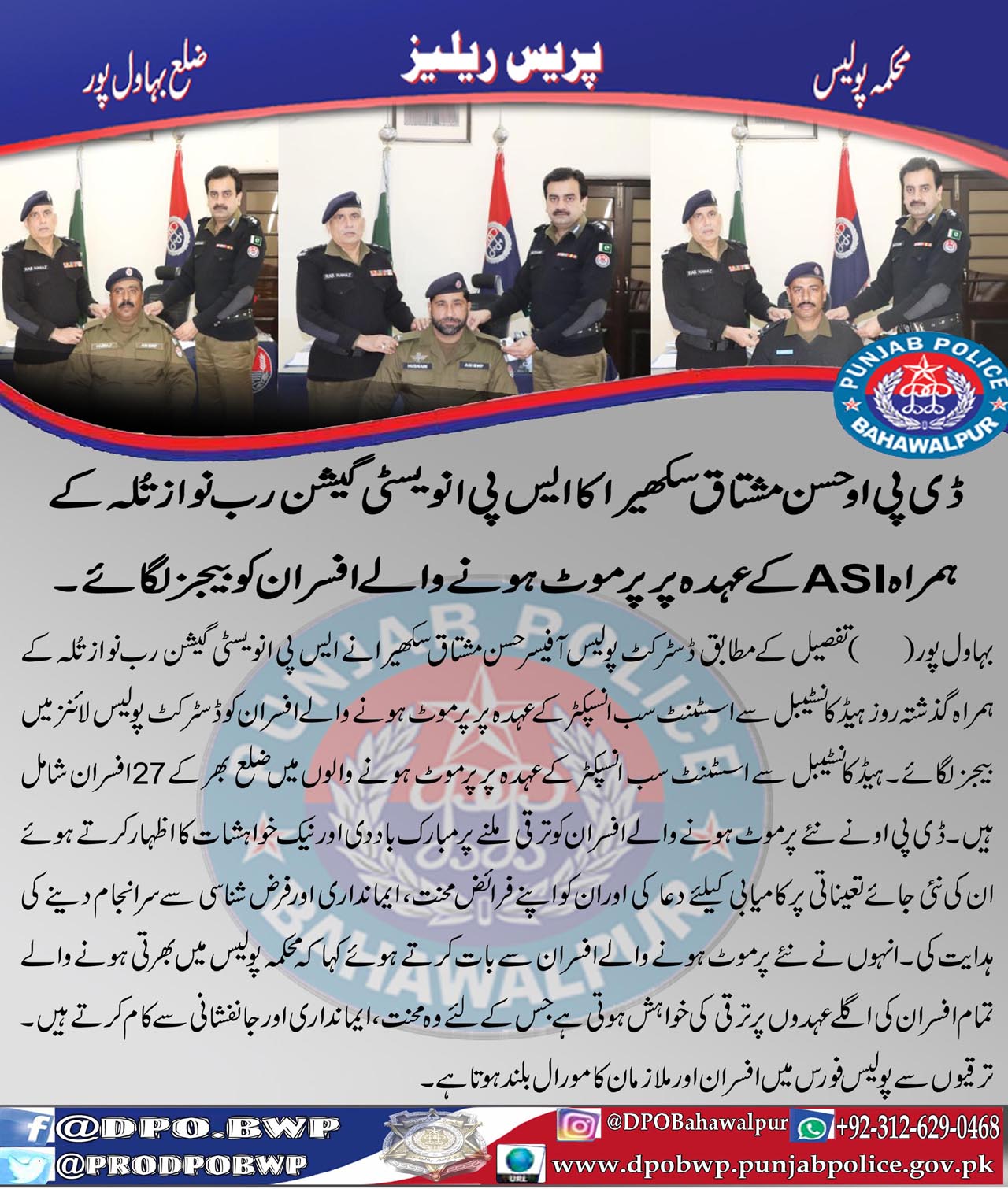 ڈسٹرکٹ پولیس آفیسر حسن مشتاق سکھیرا کا ایس پی انوسٹی گیشن رب نواز تُلہ کے ہمراہ ہیڈ کانسٹیبل سے اسسٹنٹ سب انسپکٹر کے عہدہ پر پرموٹ ہونے والے افسران کو بیجز لگائے۔۔۔