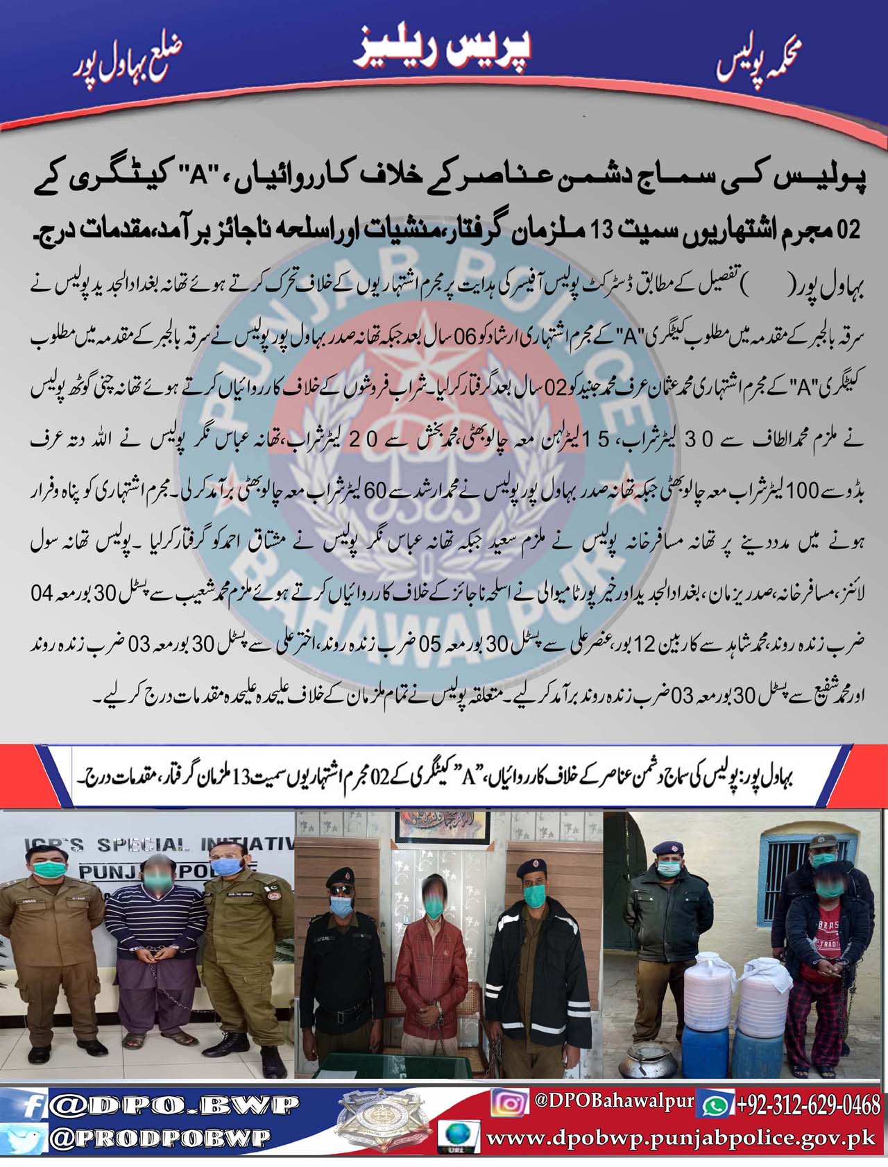 پولیس کی سماج دشمن عناصر کے خلاف کارروائیاں، "اے " کیٹگری کے 02 مجرم اشتہار یوں سمیت 13 ملزمان گرفتار، منشیات اور اسلحہ ناجائز برآمد، مقدمات درج۔ ۔