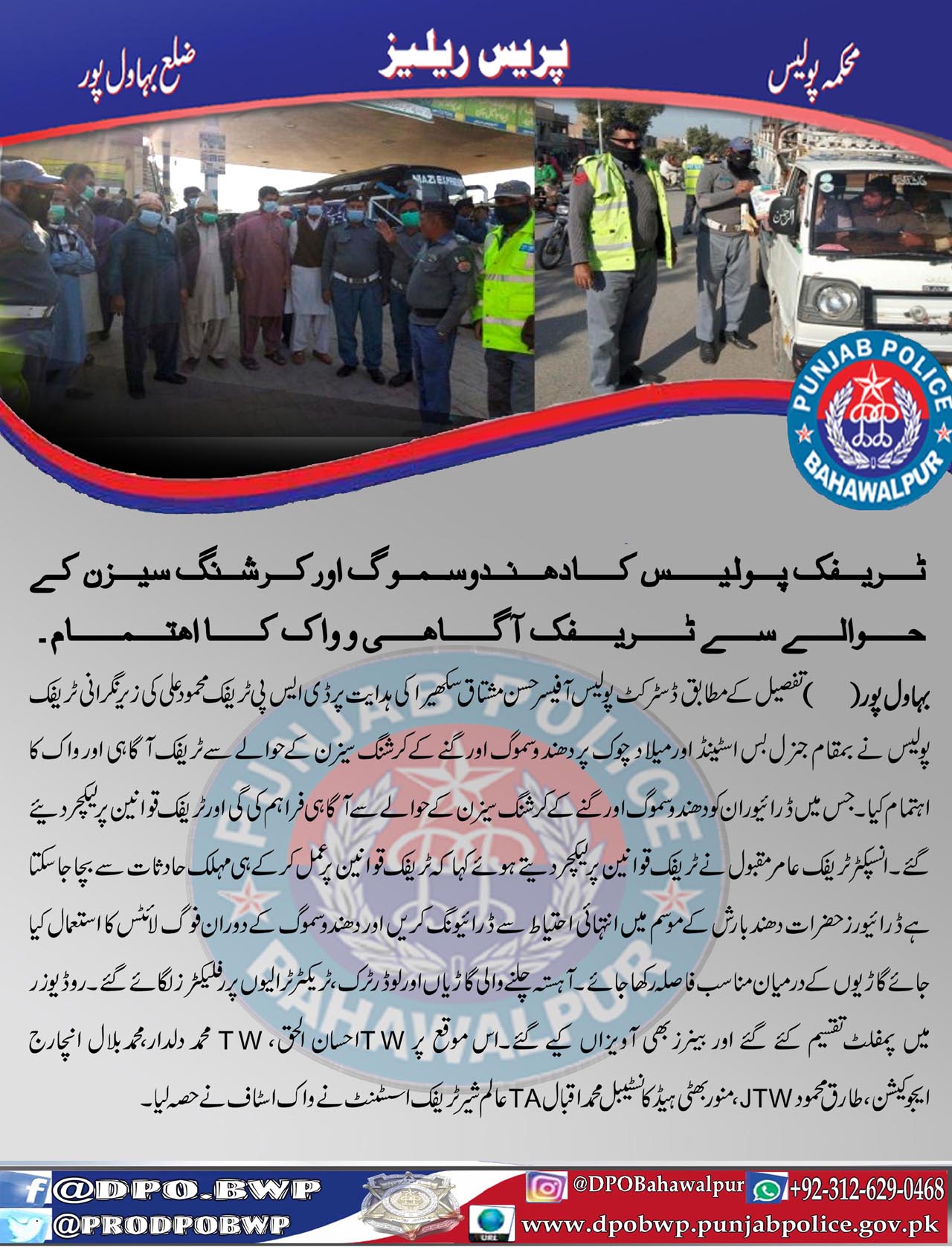 ٹریفک پولیس کا دُھند و سموگ کرشنگ سیزن کے حوالے سے ٹریفک آگاہی اور واک کا اہتمام۔ ۔