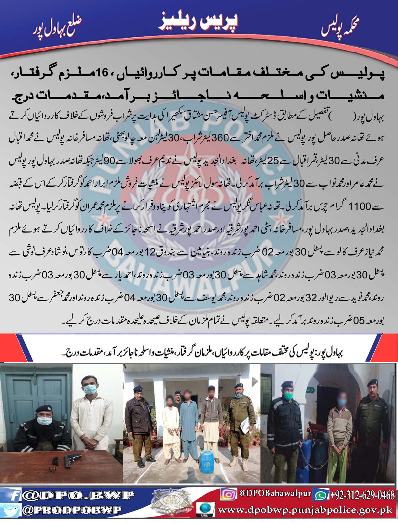 پولیس کی مختلف مقامات پر کارروائیاں، 16 ملزم گرفتار ، منشیات اور اسلحہ ناجائز برآمد، مقدمات درج
