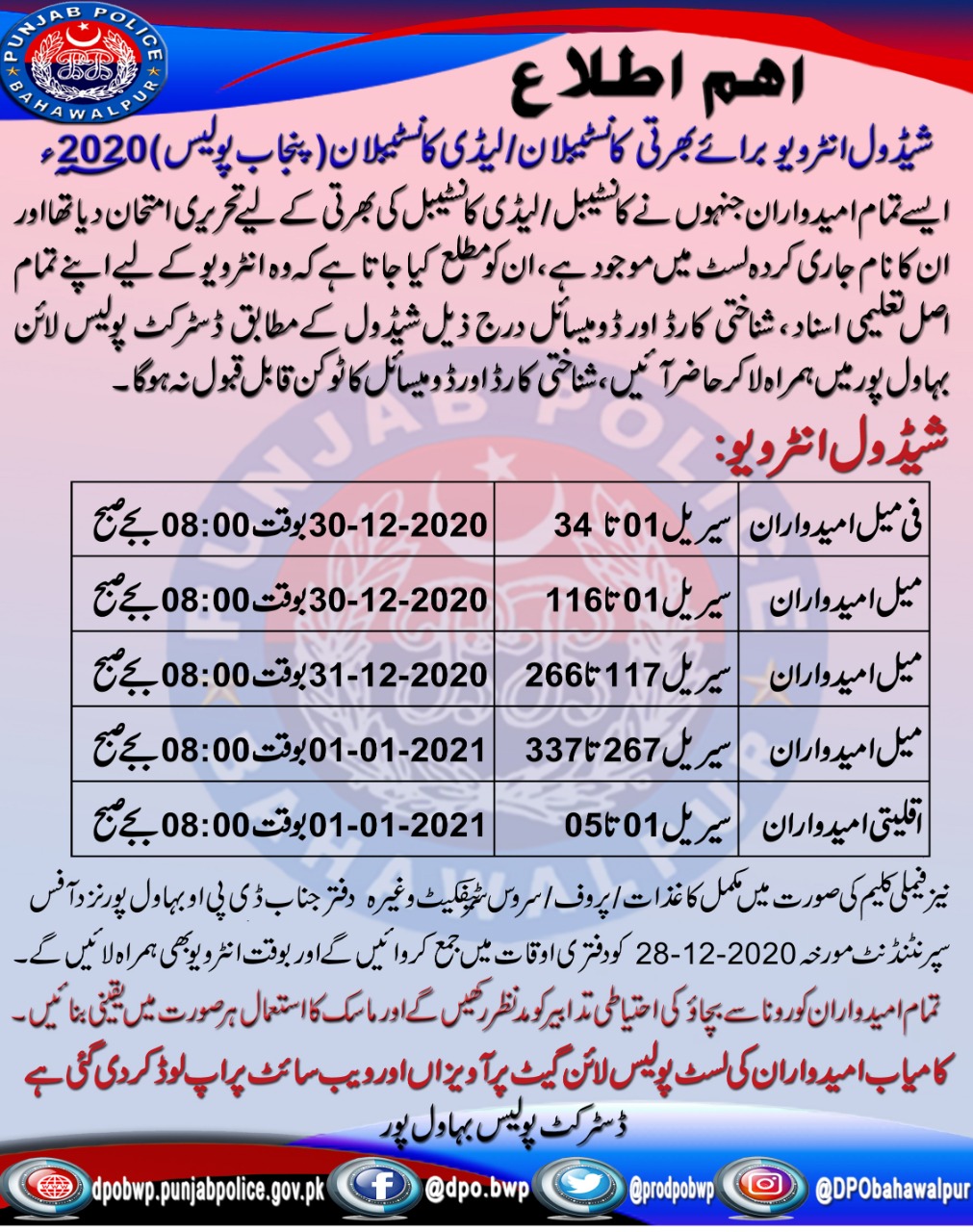 ایسے تمام امیدواران جنہوں نے کانسٹیبل و لیڈی کانسٹیبل کی بھرتی کےلیے تحریری امتحان دیاتھا اور ان کا نام لنک میں دی گئی لسٹ میں موجود ہے ، ان کو مطلع کیا جاتا ہے کہ وہ انٹرویو کے لیے اپنے تمام اصل تعلیمی اسناد، شناختی کارڈ اور ڈومسائل درج ذیل شیڈول کے مطابق ڈسٹرکٹ پولیس لائن بہاولپور میں ہمراہ لاکر حاضر آئیں ، شناختی کارڈ اور ڈمیسائل کا ٹوکن قابل قبول نہ ہوگا۔