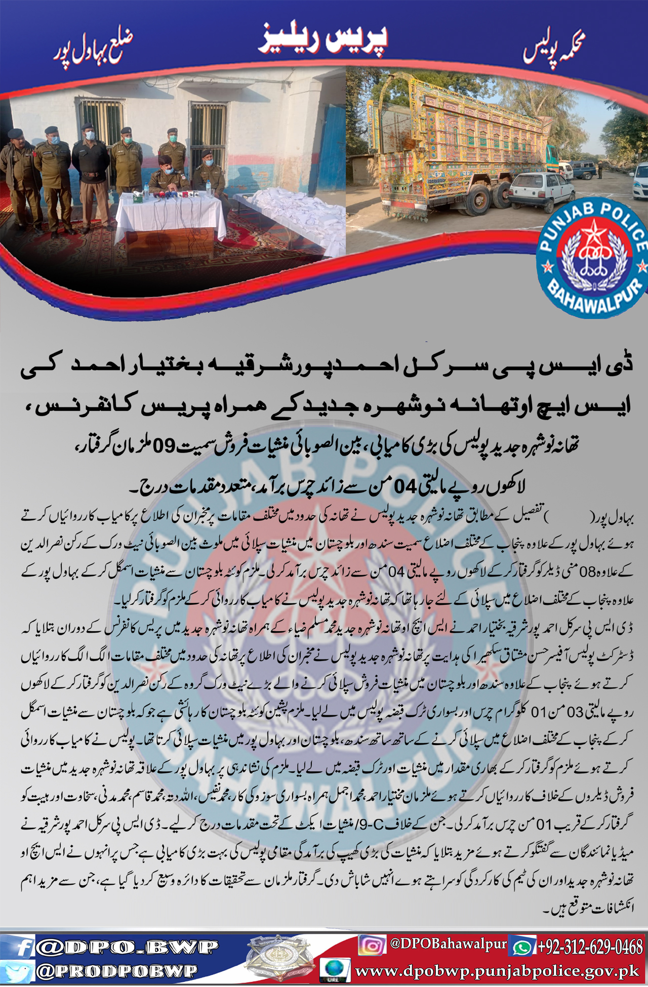 ڈی ایس پی سرکل احمد پور شرقیہ بختیار احمد کی ایس ایچ او تھانہ نوشہرہ جدید کے ہمراہ پریس کانفرنس، نوشہرہ پولیس نے بین الصوبائی منشیات فروش سمیت 09ملزمان کو گرفتار کرکے ان کے قبضہ سے 04من سے زائد چرس برآمد کرلی، مقدمات درج۔ ۔