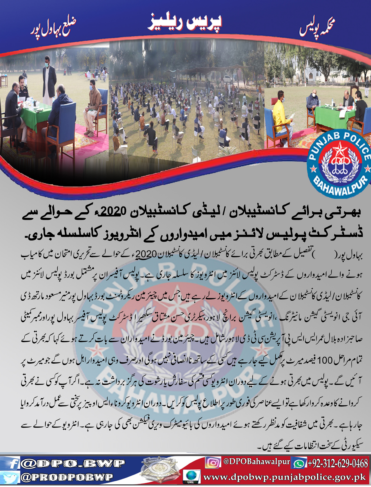بھرتی برائے کانسٹیبلان /لیڈی کانسٹیبلان 2020کے حوالے سے ڈسٹرکٹ پولیس لائن میں امیدواروں کے انٹرویوز کا سلسلہ جاری۔ ۔